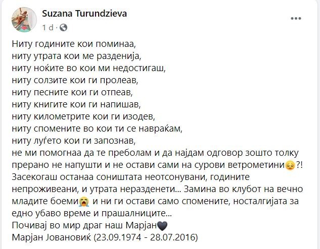 Како и секоја година, Турунџиева со емотивна објава се присети на својот препрано починат сопруг.