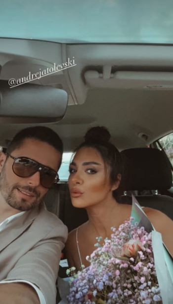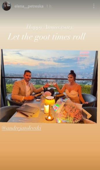 Елена сподели и дел од романтичната прослава, таа по повод оваа свечена прилика носи бел топ и долен дел во беж боја, додека нејзиниот партнер се одлучил за сако во беж боја и бела кошула. Не знаеме дали парот случајно или намерно е ускладен со бојата на облеката, но едно е сигурно, блискат од среќа и двајцата.