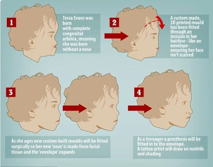 Теса поминала низ низа операции додека растела. Лекарите и ставиле протеза. Предвидени се уште неколку интервенции за реконструкција на носот. На крајот, сè требаше да се направи совршено, но ќе биде потребно време, признаваат експертите.