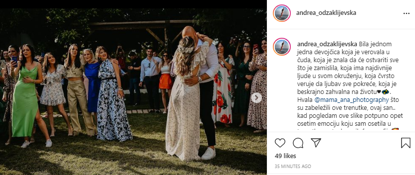 Ова е дел од пораката која Андреа Оџаклиевска ја објави на Инстаграм, постирајќи неколку фотографии од свадбената веселба која се случи во саботата.