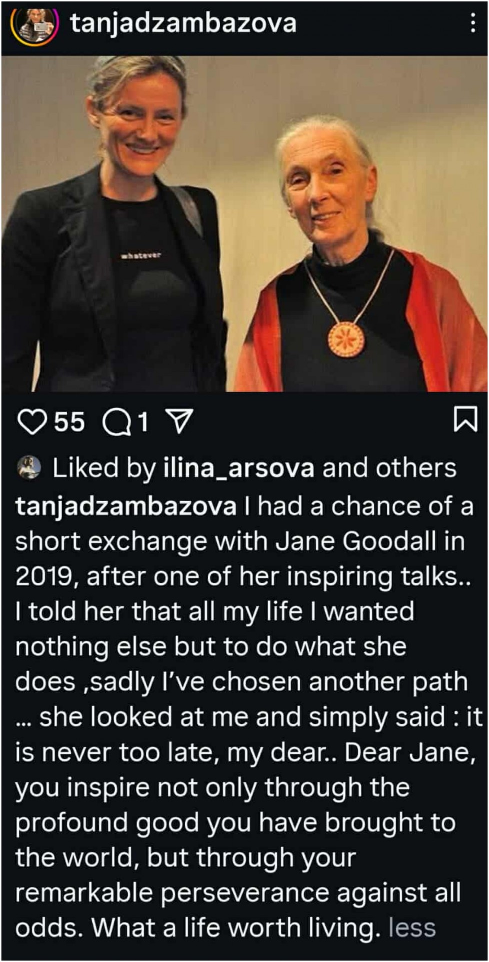 „Имав можност за кратка размена на мислења со Џејн Гудал во 2019 година, по еден од нејзините инспиративни говори... Ѝ кажав дека целиот мој живот не сакав ништо друго освен да го правам она што го прави таа, за жал, избрав друг пат... таа ме погледна и едноставно рече: ‘Никогаш не е предоцна, драга моја…’ Драга Џејн, ти инспирираш не само преку длабокото добро што си го донела на светот, туку и преку твојата извонредна упорност наспроти сите пречки. Каков живот вреден за живеење.“