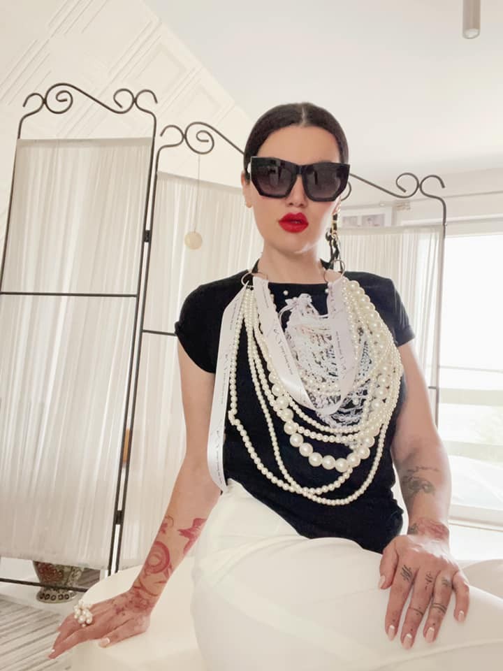 Ова уникатно парче, креаторката на брендот за накит „Драма“, Ивана Кнез го создаде токму за д-р Мусиќ Милановиќ, која е познат епидемиолог. Хрватскиот магазин понатаму вели дека Сања е воодушевена од дизјанерката Кнез која смета дека таа може и знае да носи такви модни додатоци.