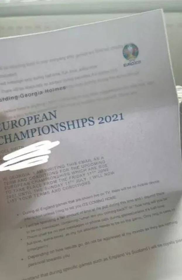 Џорџија Холмс го објави на ТикТок договорот што и го испратил нејзиното момче Џоел во пресрет на почетокот на шампионатот. Во договорот, тој утврдил низа правила за тоа како би се однесувал додека трае „фудбалското лудило“ и тој не ја воодушевил.
