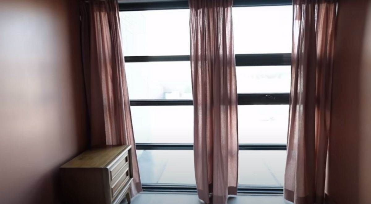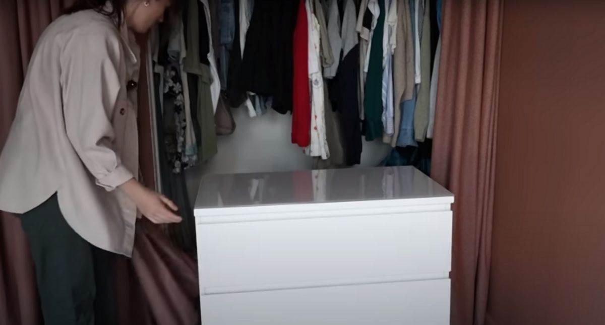 Првиот чекор бил отстранување на вратите од плакарот, бидејќи зафаќале премногу простор и удирале во ноќните масички. Наместо нив, поставени се завеси на плафонска шина, кои визуелно го делат просторот и го сокриваат плакарот. Така се добило место и за мала комода.