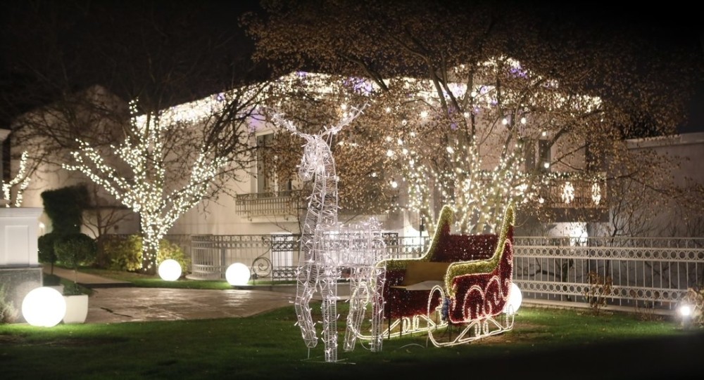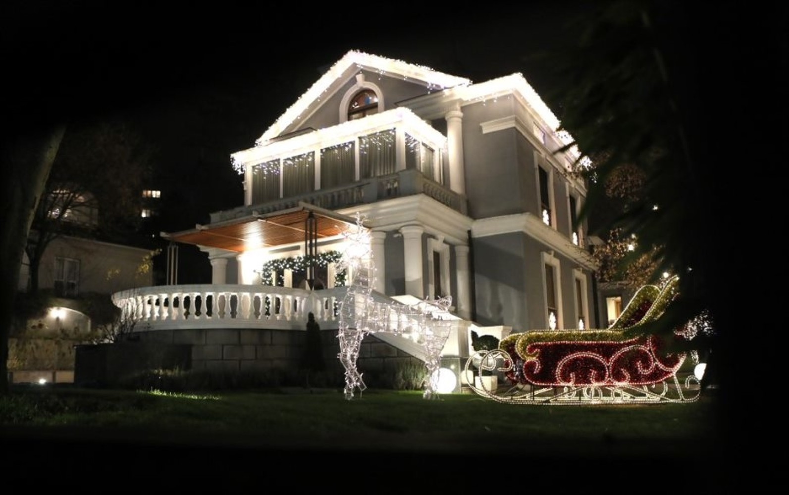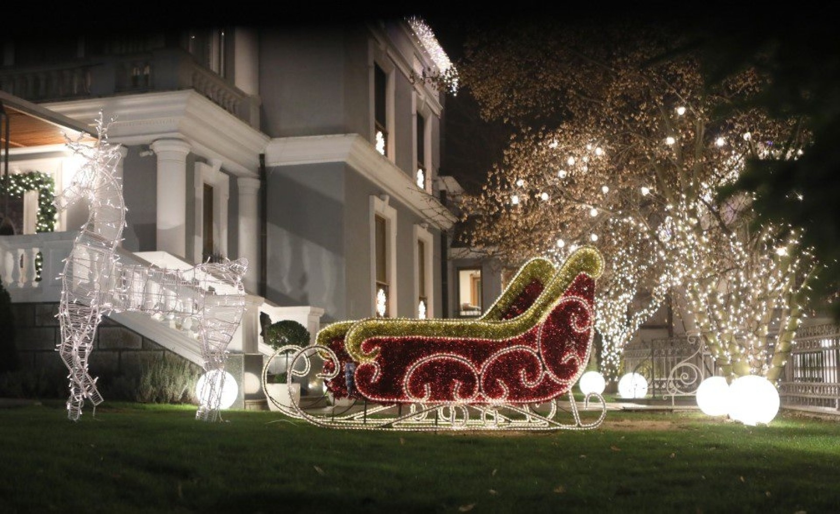 Сијалички по целиот покрив, како и на предната тераса, додека во дворот се паркирани огромни санки.