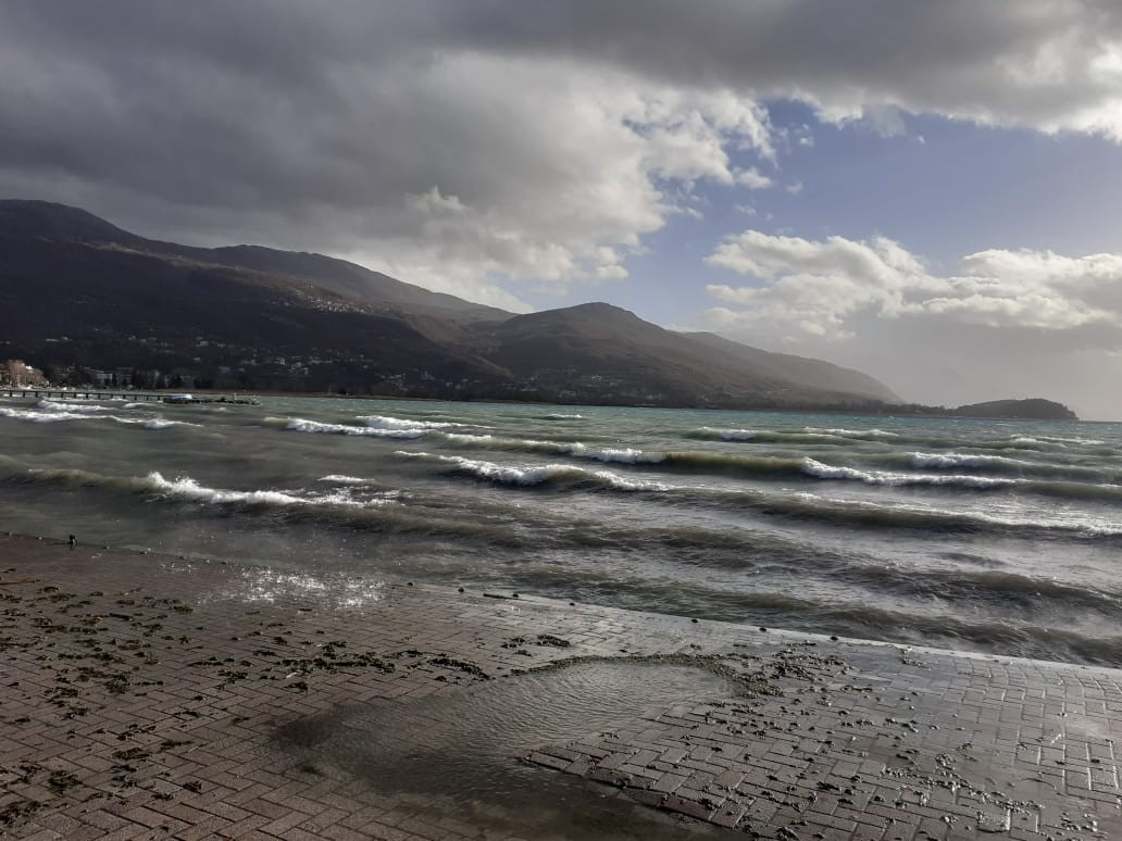 Охрид годинава не е предновогодишно полн како други години. Барем не ако се гледа по градскиот кеј. На шеталиштето покрај езерото нема буквално никој. Поради силниот ветер и големите бранови, кејот е поплавен, а малкуте туристи и мештани се шетаат по стазата паралелно со кејот или во чаршијата. Кафе баровите и рестораните се главно полни, и се одржува пропишаната дистанца. Охрид е традиционално убаво украсен и годинава.