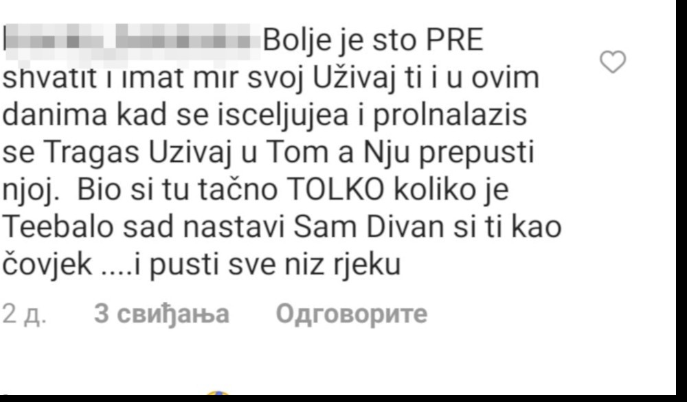 - Подобро е што е можно побрзо да прифатите и да имате мир, свое задоволство, дури и во овие денови кога ќе се лекувате и ќе се пронаоѓате себеси, да пребарувате, да уживате во тоа и да се препуштите на неа. Бевте таму точно колку што траеше, и сега продолжи сам. Ти си прекрасен маж и остави да оди сè низ реката – е еден од коментарите на еден од следбениците, но Игор не одговори.