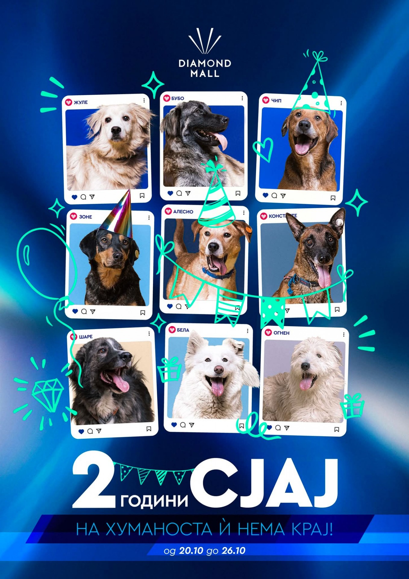 Diamond Mall ја започна својата роденденска прослава со повик до граѓаните на заедничка хумана мисија, посветена на грижа за напуштените животни и поттикнување на нивно вдомување. Наместо класична прослава,Diamond Mall преку низа активности сака да ја подигне свесноста за грижата за бездомните животни и да ги поттикне граѓаните повеќе да вдомуваат улични кучиња.