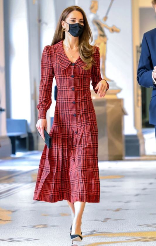 Патем, овој ефективен фустан со средна должина со кариран дизајн, пуф ракави и црни копчиња е украсен со необичен пресек - ја следи линијата на телото до колковите, а потоа се шири во плисирана форма. Но, бидејќи сопругата на принцот Вилијам е екстремно витка и висока, таа лесно може да го носи секој крој, без да се плаши како тоа ќе и одговара.