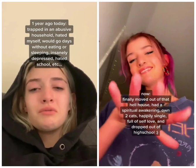 Тогаш снимката се менува и ја гледаме оваа тинејџерка насмеана, добро расположена и со виолетова коса. „Сега: конечно се иселив од пеколната куќа, имав духовно будење, имам две мачки, среќно сум слободна, полна со љубов за себе и го напуштив средното училиште“, ја опишала моменталната состојба.