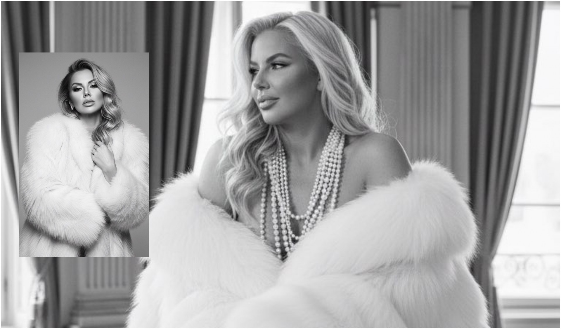 На првата фотографија, Андријана седи врз пијано, обвиена во волшебна бела бунда, со бисери кои паѓаат по нејзината кожа како продолжување на клавирската мелодија. Кадарот е чиста филмска сцена – како каде што би ја замислиле една космополитска уметница што патува низ елитните европски сали. Стилот е раскошен, но не претерува; ја одразува токму нејзината музика: класична со современа, гламур со суптилност.