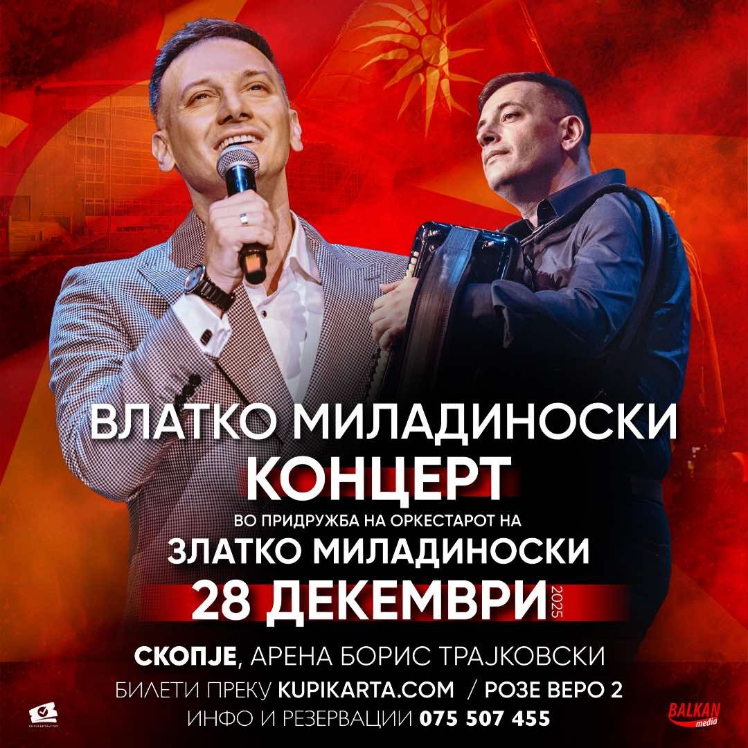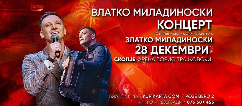 Концерт на Влатко Миладиноски на 28 декември во арена „Борис Трајковски“, во придружба на оркестарот на Златко Миладиноски