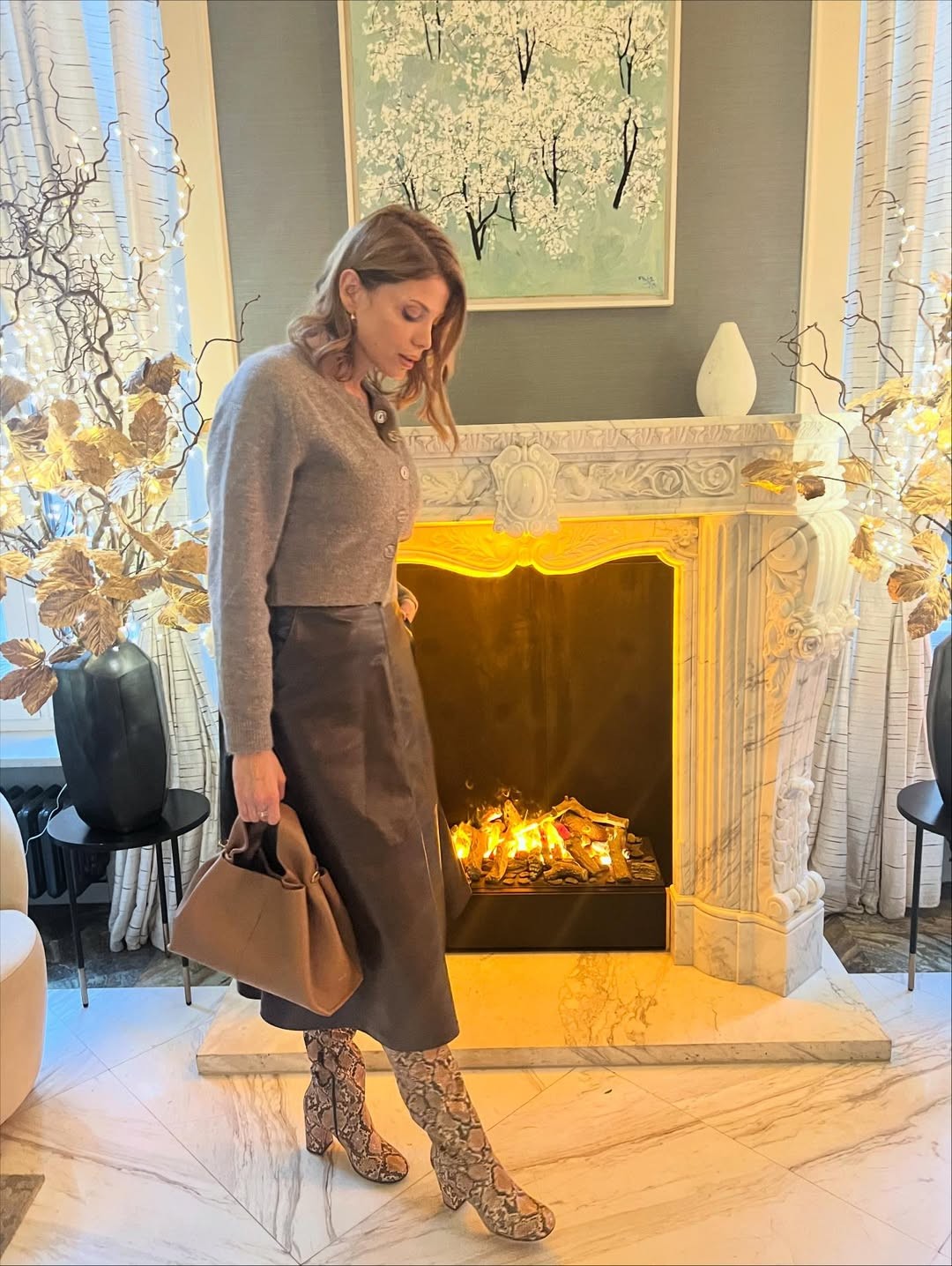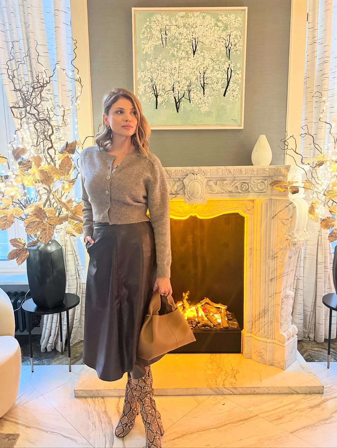 На фотографиите, Лејла позира облечена во краток беж елек со копчиња, кој го комбинирала со прекрасно кафеаво кожно здолниште со средна должина. Здолништето со А-крој изгледа исклучително елегантно и има лесна структура, па затоа убаво паѓа и создава префинета силуета.
