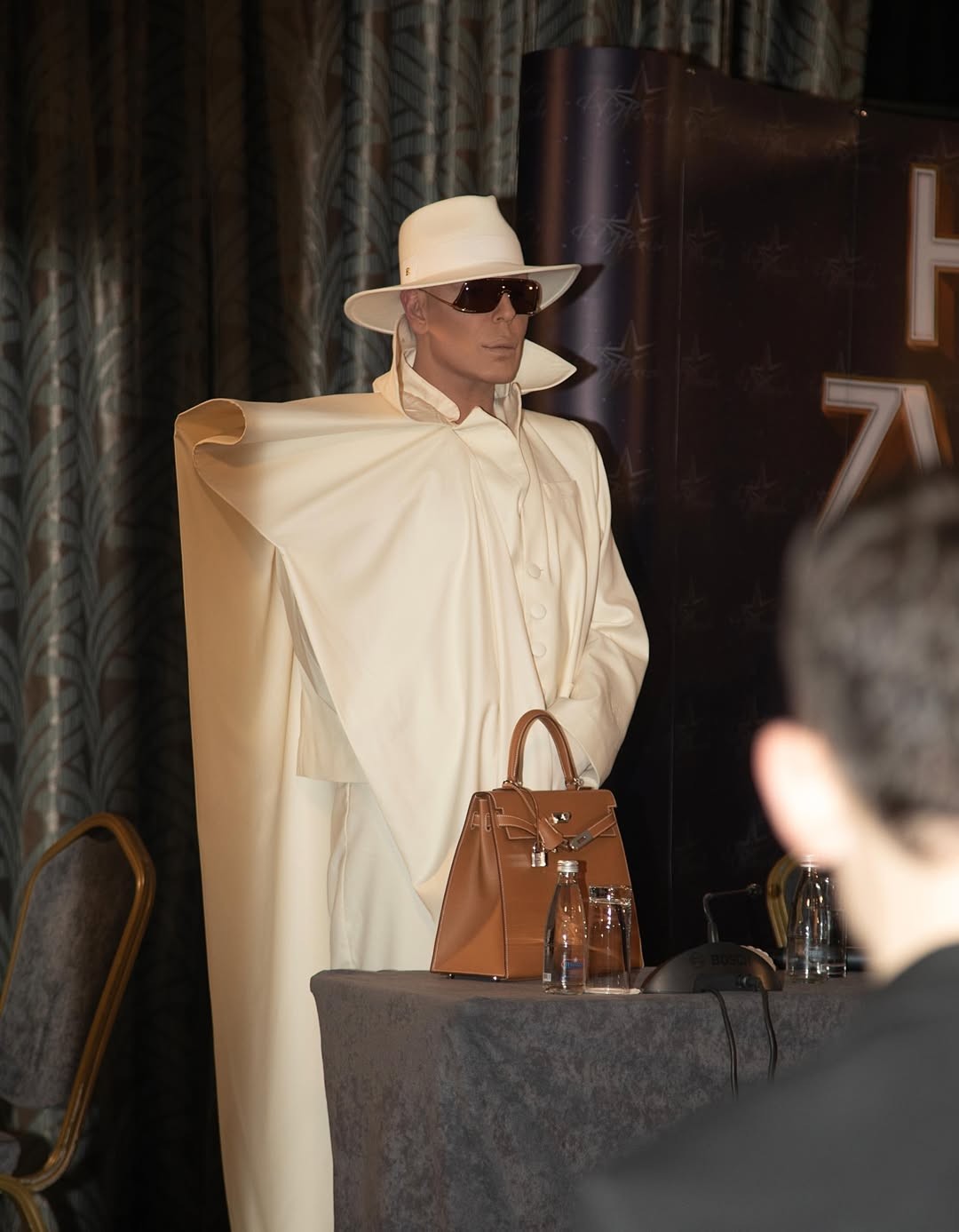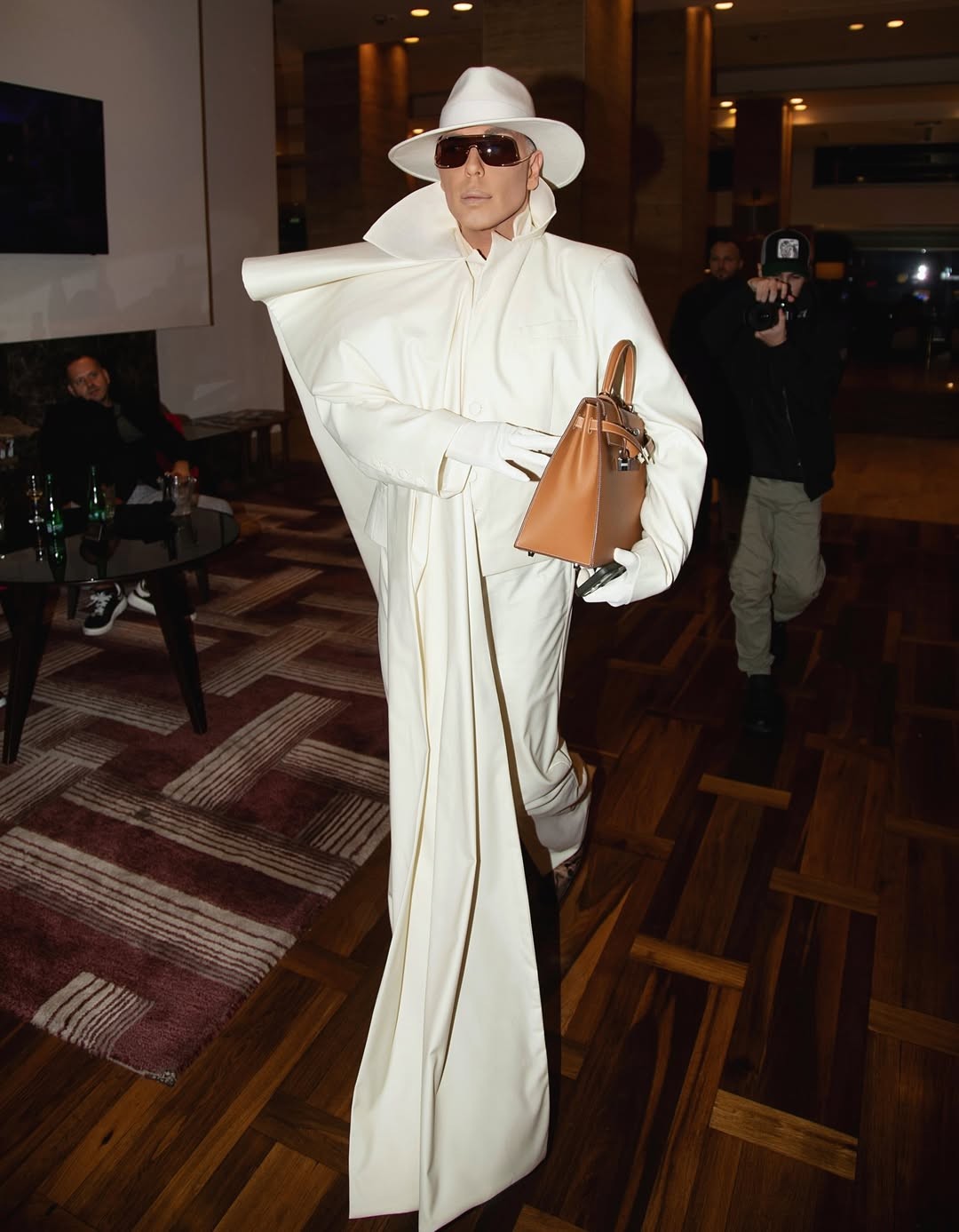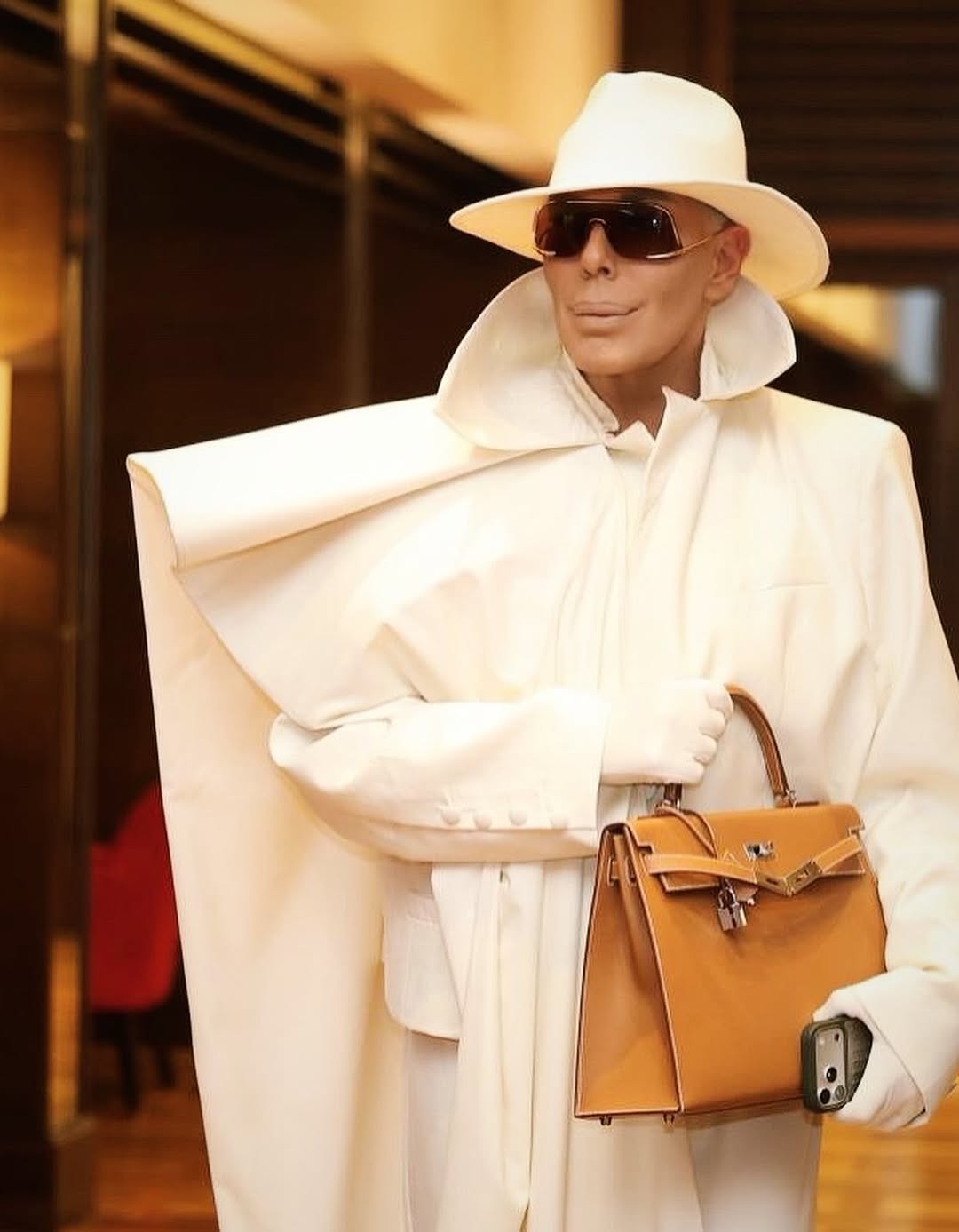 Првиот стајлинг беше бестрашен визуелен удар: бела couture-наметка со скулптурални рамена, fedora шешир, ракавици и иконичната Hermès Kelly – чанта чија вредност се движи меѓу 20.000 и 30.000 евра. Овој изглед извикува моќ, контрола и апсолутна авангарда. Белата монотонија е намерно чиста, стерилна и ладна, создавајќи модна фигура што изгледа како да излегла од уметничка инсталација.
