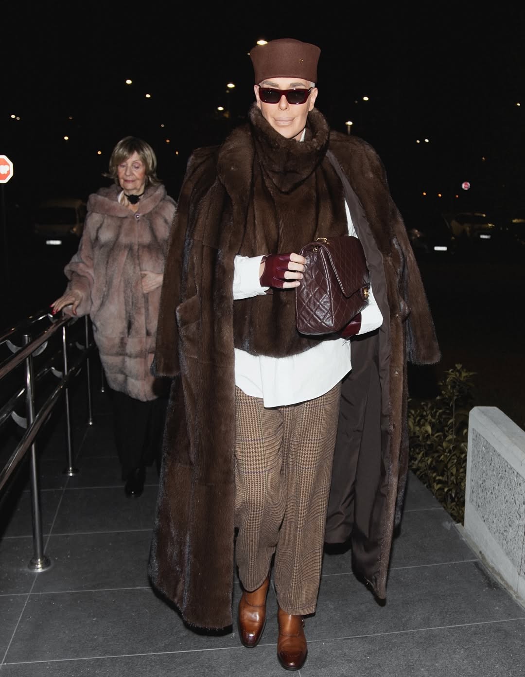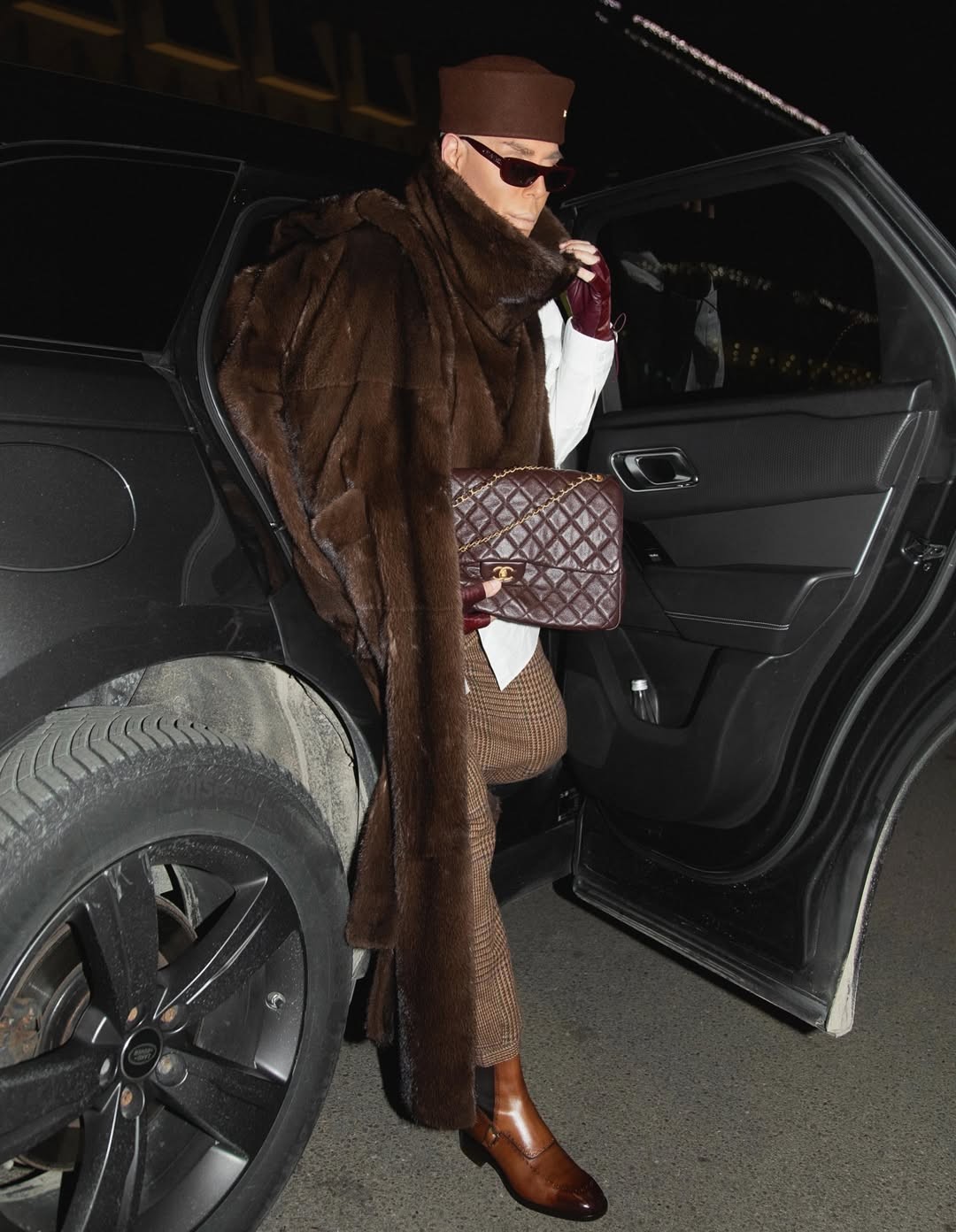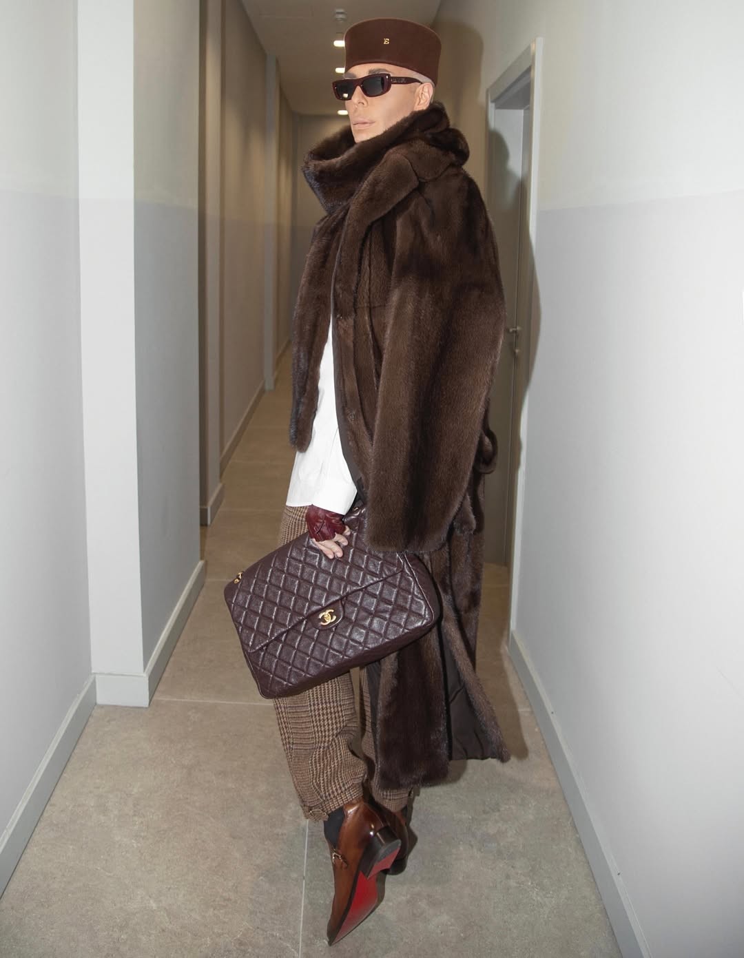 Првиот стајлинг беше бестрашен визуелен удар: бела couture-наметка со скулптурални рамена, fedora шешир, ракавици и иконичната Hermès Kelly – чанта чија вредност се движи меѓу 20.000 и 30.000 евра. Овој изглед извикува моќ, контрола и апсолутна авангарда. Белата монотонија е намерно чиста, стерилна и ладна, создавајќи модна фигура што изгледа како да излегла од уметничка инсталација.