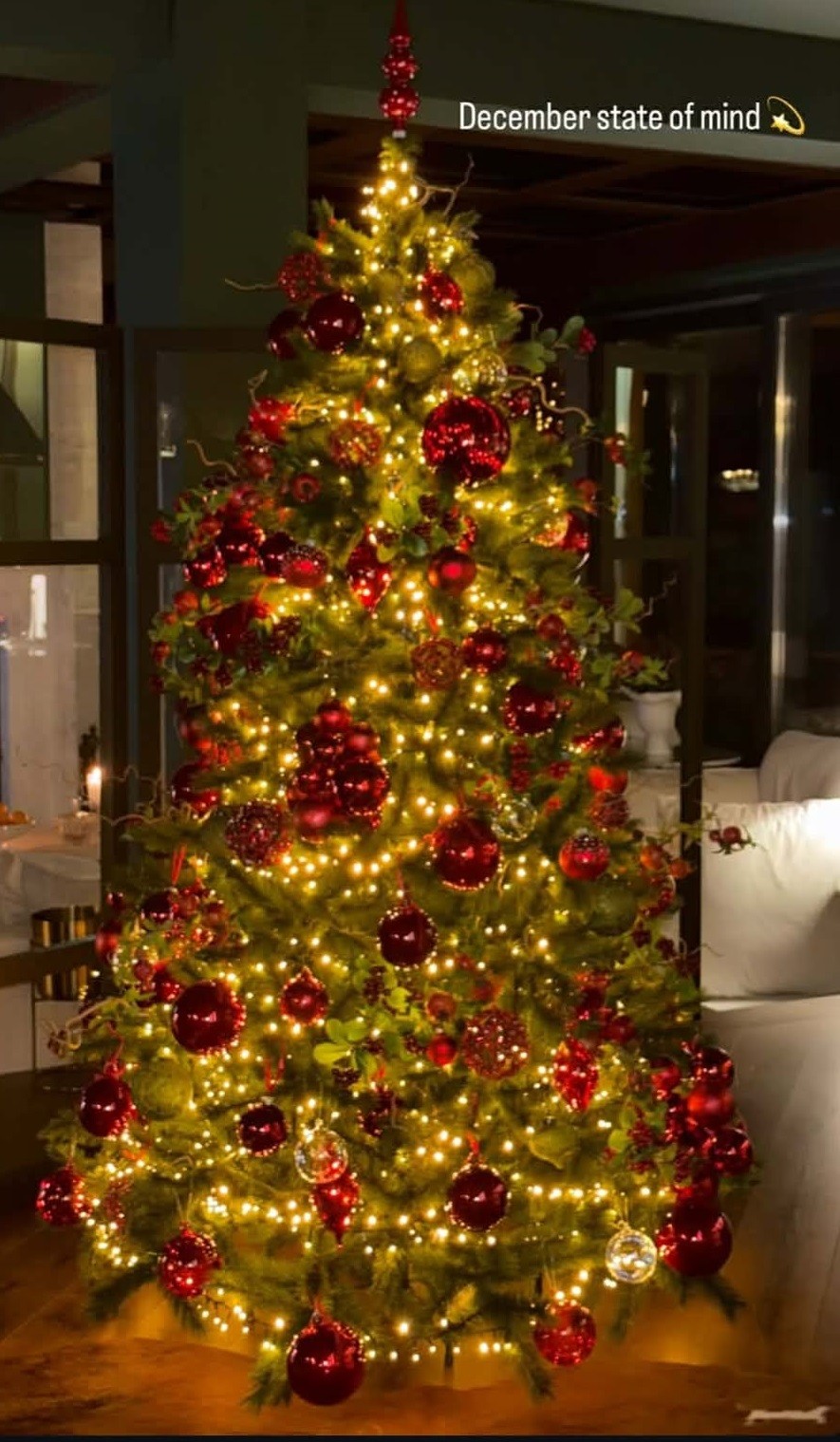 На фотографијата што ја сподели, елката блеска во класичната празнична комбинација: длабоко црвени украси и топли златести светилки што создаваат атмосфера на отменост и суптилна гламурозност.