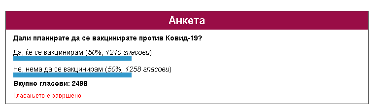 Женски Магазин спроведе он лајн анкета во која праша дали граѓаните планираат да се вакцинираат. Вашето мислење е секако важно. Според резултатите од анкетата процентот на луѓе кои планираат и тие кои не сакаат да се вакцинираат е еднаков. На анкетата се изјаснија 2.498 лица. Од вкупните гласови 50 проценти од луѓето кои гласале рекле дека ќе се вакцинираат или позитивно одговориле 1.140 луѓе. Дека нема да се вакцинираат се изјасниле 50 проценти од тие кои гласале или 1.258 луѓе.