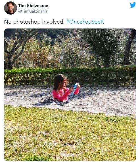 Девојчето стои пред камен ѕид, но фотографијата е направена од агол, така што изгледа како горниот дел од телото да ѝ „извира“ од бетонот.