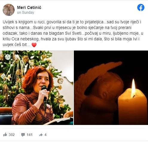 „Секогаш со книга во рака, зборуваше дека е книгата е твојата пријателка... Сега твоите зборови и стихови се кај нас.. Секој први во месецот е болен спомен на твоето прерано заминување, затоа денес на празникот на Сите Светци... Почивај во мир, возљубена моја, во прегратките на Отецот Небесен, ти благодарам за сета љубов што ми ја даде, беше мојата Ива и секогаш ќе бидеш“, напиша таа покрај фотографијата и растажи многумина.