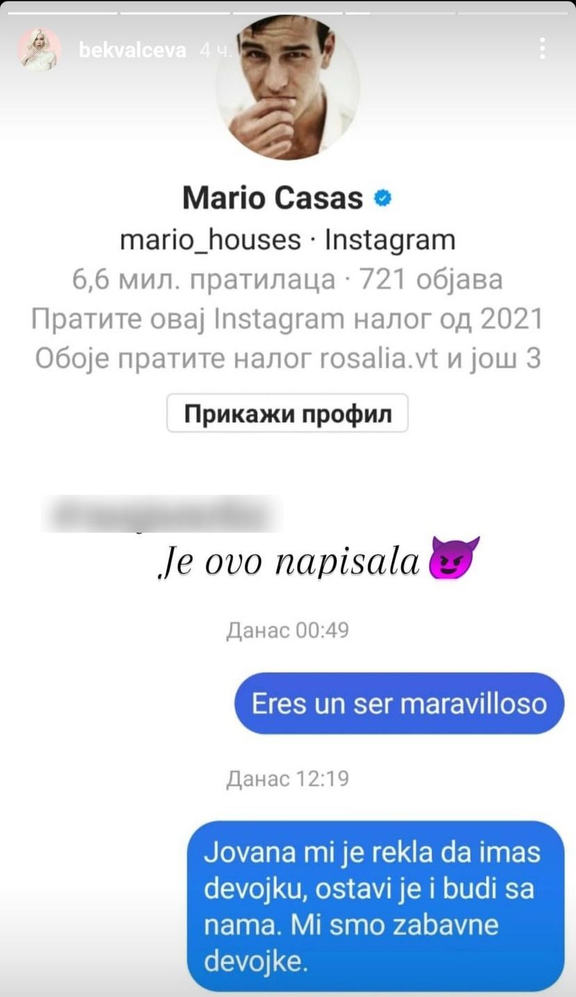 - Ти си прекрасно човечко суштество. Јована ми кажа дека имаш девојка, остави ја и биди со нас. Ние сме забавни девојки - тоа е една од пораките што ги добил Марио.