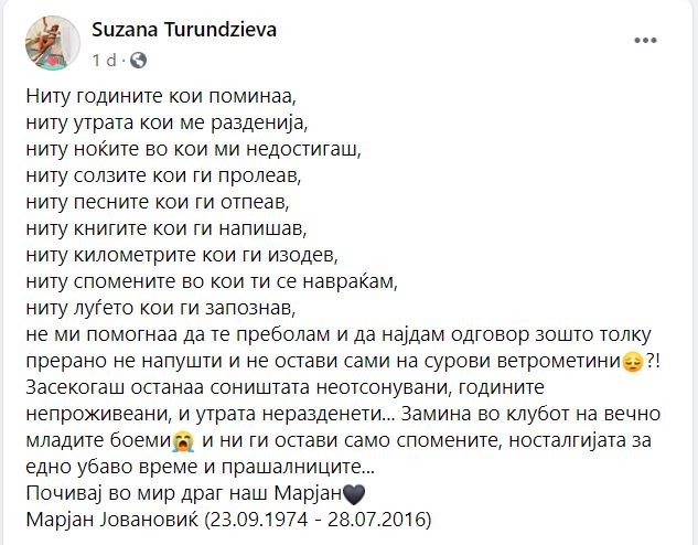 Сузана Турунџиева со емотивна објава се присети на својот препрано починат сопруг, од чиј брак ја има ќерката Матеа.