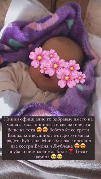 „И официјално го одбравме името на нашата мала принцеза и секако идејата беше тета. Бебето ќе се крсти Емона, кое всушност е старото име на градот Љубљана. Мислам дека е идеално, две сестри Емона и Љубљана. Поубаво не можеше да биде. Тета е царица“, пишува на објавата на Инстаграм стори, на водителката.