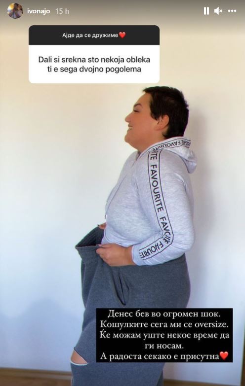 „Ден за ден секое парче гардероба кое го носев пред месец дена различно стои на мене. Овие тренерки беа омиленото парче гардероба но за жал ќе мора да земеме друг пар со минимално два конфекциски броја помали.