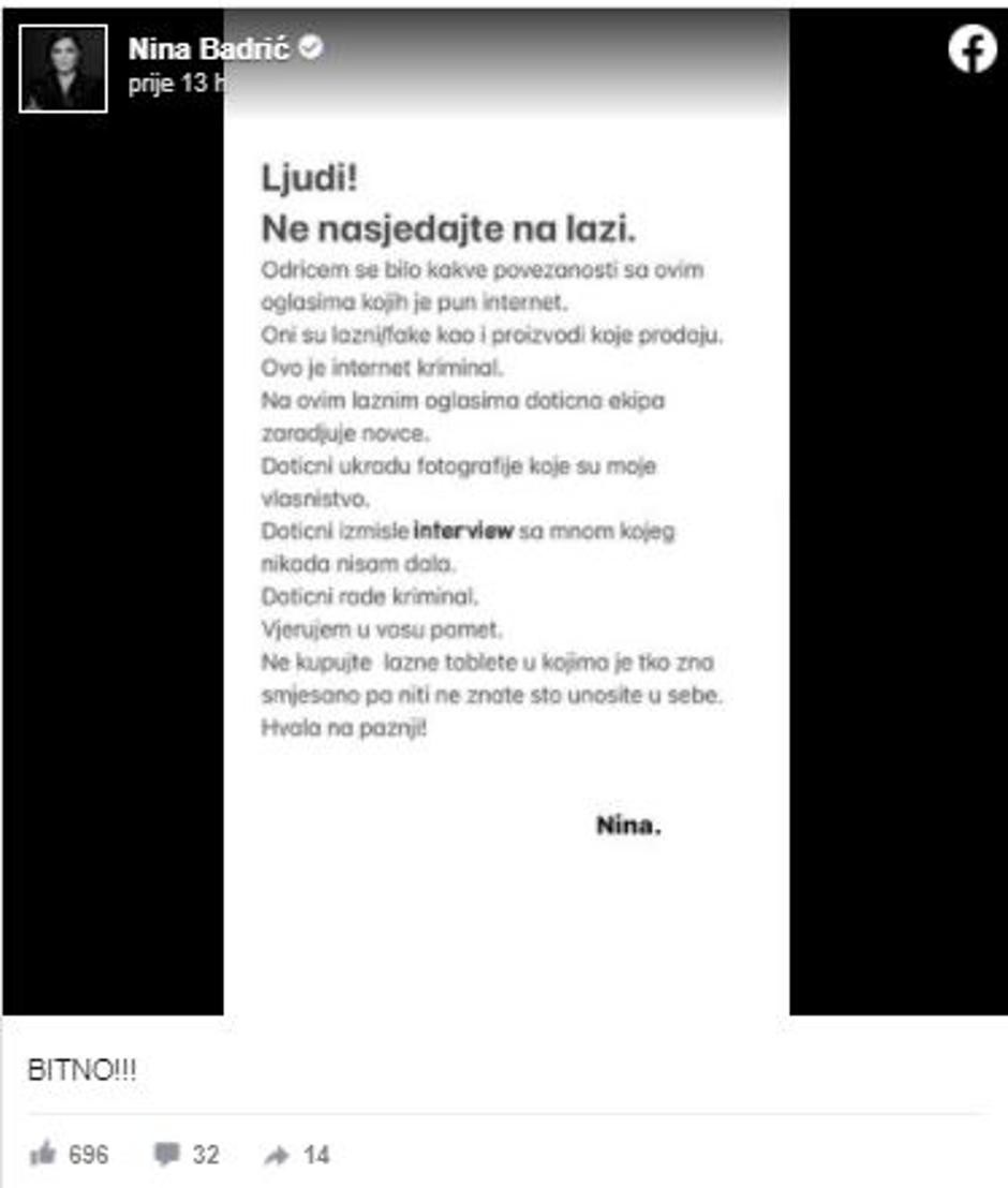 "Дотични личности крадат фотографии што се моја сопственост. Тие измислуваат интервју со мене што не сум го дала. Прават злосторство. Верувам дека сте паметни", напиша Нина и продолжи: "Не купувајте лажни апчиња што имаат кој знае што во нив, па нема ни да знаете што внесувате во себе. Ви благодарам за вниманието “, заклучи таа.