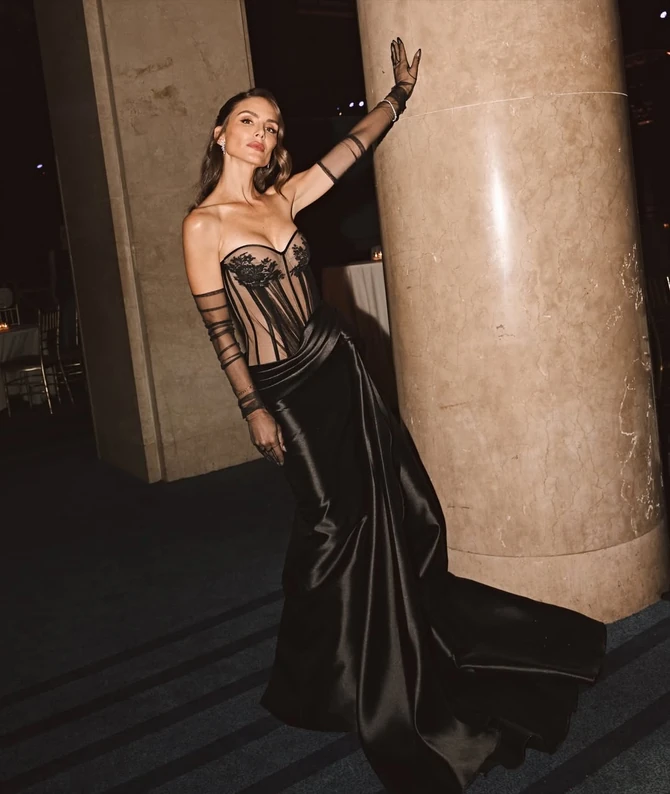 Нина Сеничар се претстави во две модни изданија што ги покажа на Инстаграм. Носеше фустан со корсет со длабок струк, провокативен топ и долго сатенско здолниште.