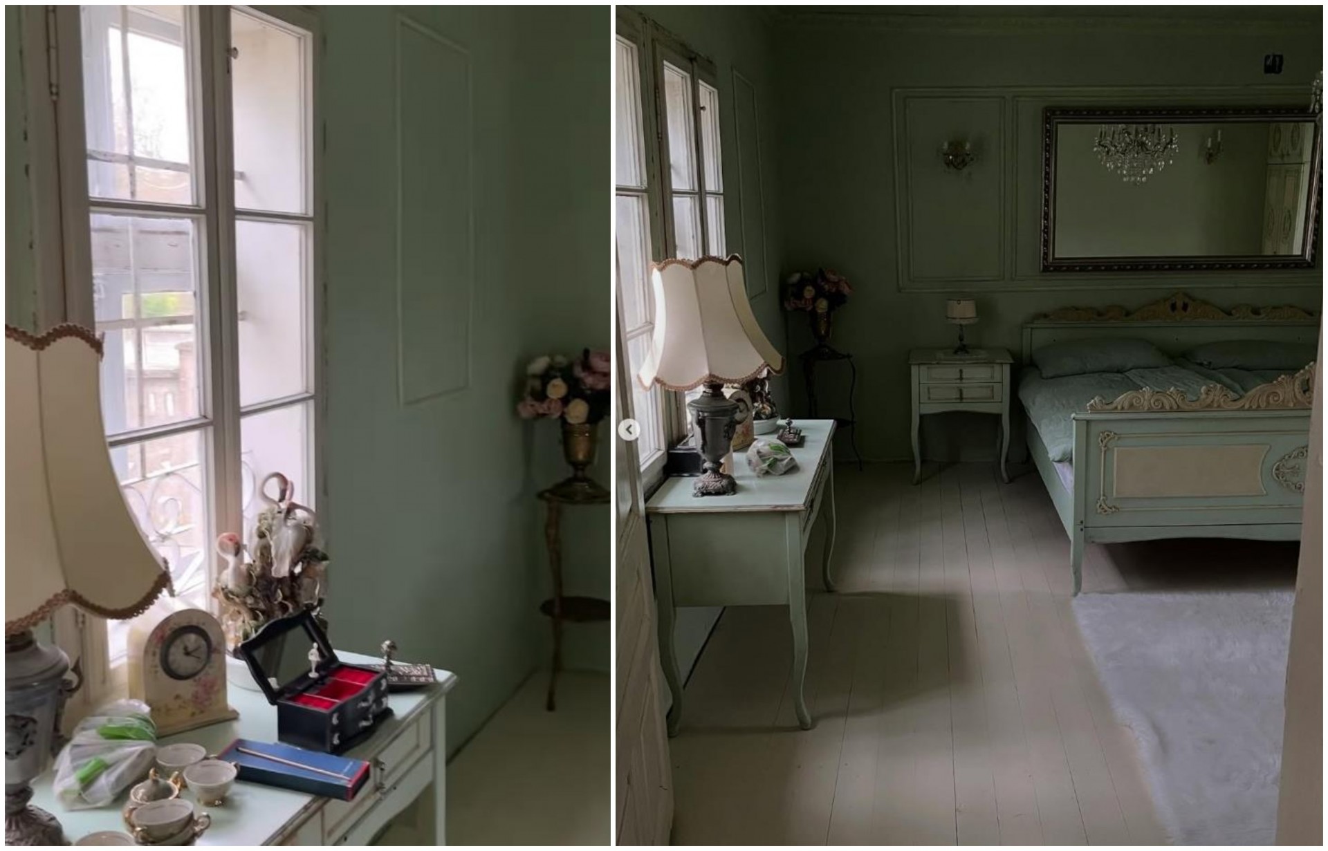 Најголемо воодушевување предизвика спалната соба која личи како да е извадена од романтичен филм: винтиџ кревет во светлозелена боја, лустер со нежна светлина, старинско огледало во златна рамка и ламби со абажури — секој детаљ зрачи со елеганција и топлина на домот. Дури и порцеланските шолји на ноќната масичка станаа заштитен знак на ентериерот, каде се среќаваат англиски шарм и српска душа.