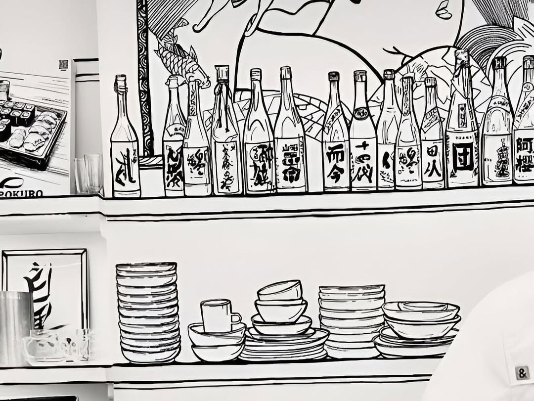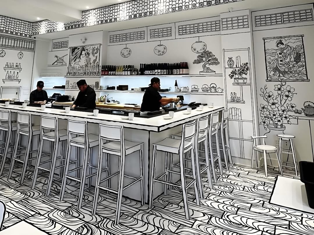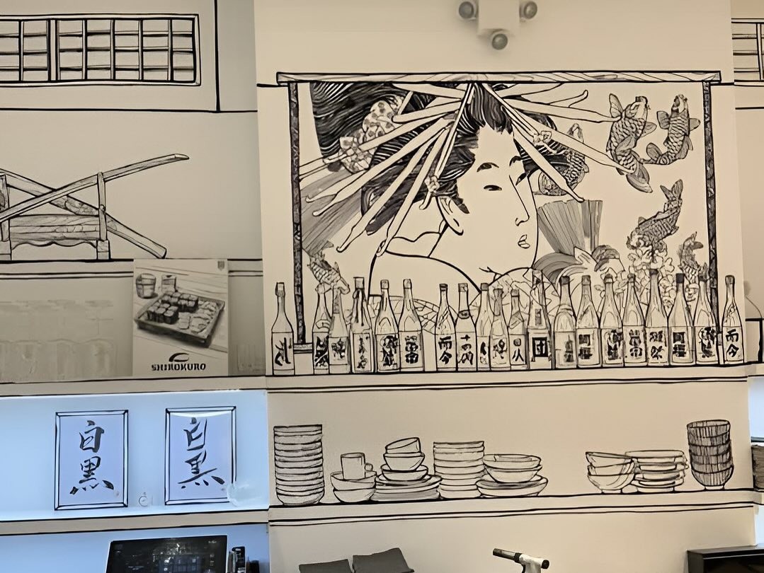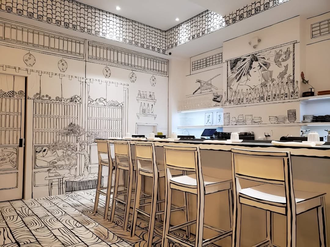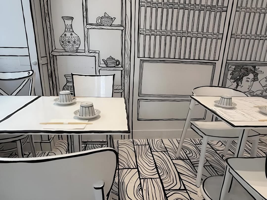 Концептот е едноставен, но исклучително ефективен: целиот ентериер, од подот до таванот, е обоен на таков начин што изгледа како да е искинат од црно-бел манга стрип. Дебелите, рачно нацртани линии создаваат совршена илузија на дводимензионален простор, па гостите имаат впечаток дека влегле во некоја паралелно скицирана реалност.