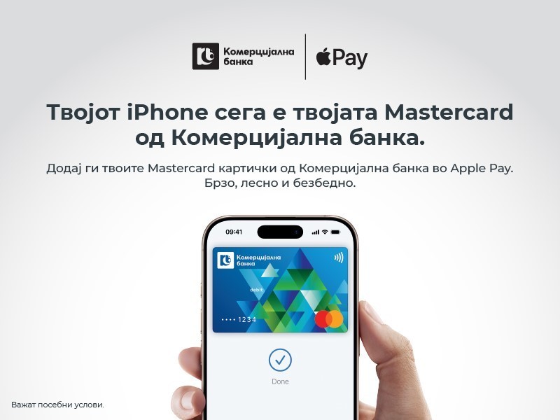 Со Apple Pay, Комерцијална банка ти ги овозможува најиновативните решенија таму каде што ти се најпотребни – во твојата рутина. Додавањето на твоите картички во Apple Wallet е еден мал, паметен чекор кон повеќе слобода и помалку грижи.