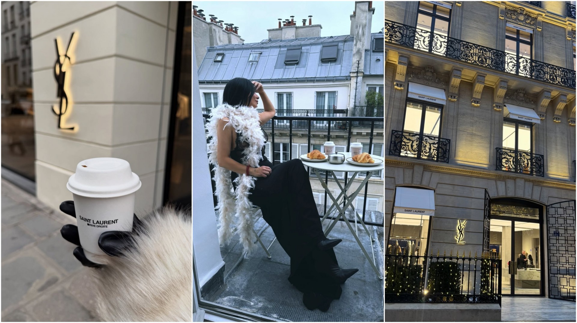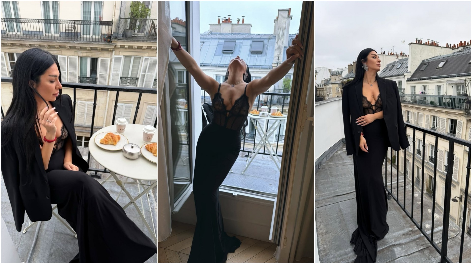 Покрај празничните прошетки, престојот во Париз пејачката го искористи и за стилска фотосесија налик на модните едиторијали. Таа позира во свечена црна тоалета, на балкон со препознатлив париски амбиент, уживајќи во француски појадок – кафе и кроасан, симбол на елеганцијата и духот на градот на светлината.