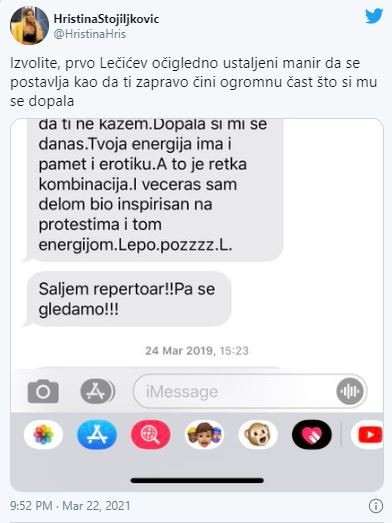 Во низата пораки за кои тврди дека Лечиќ ѝ ги испратил, меѓу другото, тој напишал: "Христина, не можам да одолеам да не ти кажам. Ми се допадна денес. Твојата енергија има памет и еротика. И тоа е ретка комбинација. И вечерва делумно бев инспириран на протестите и од таа енергија. Убаво. Поздрав, Л. ""