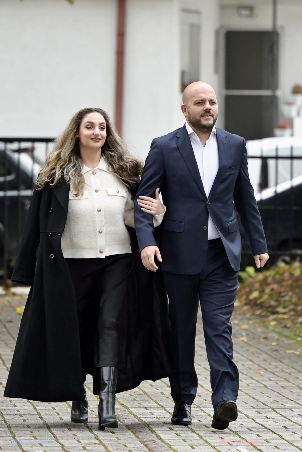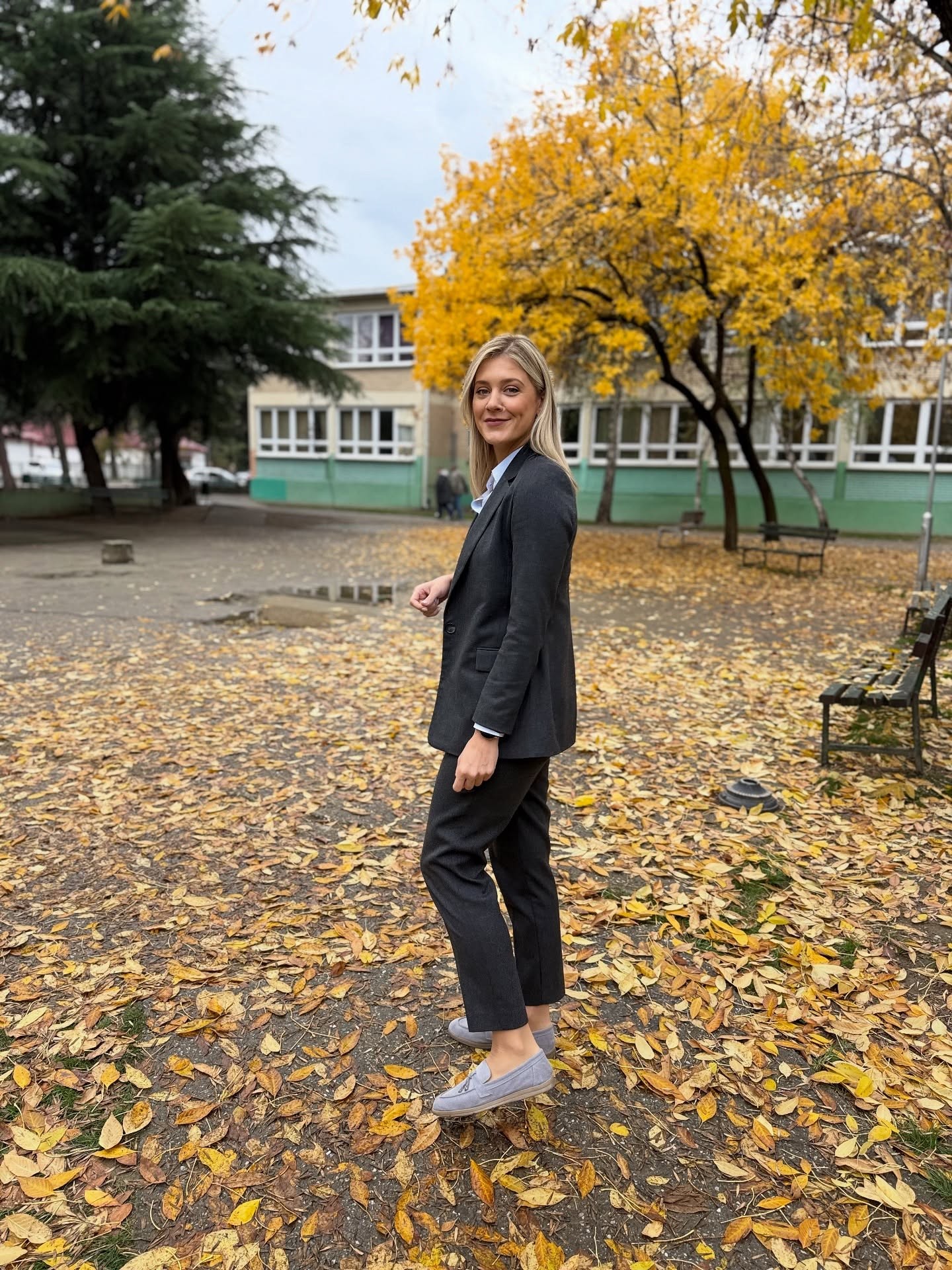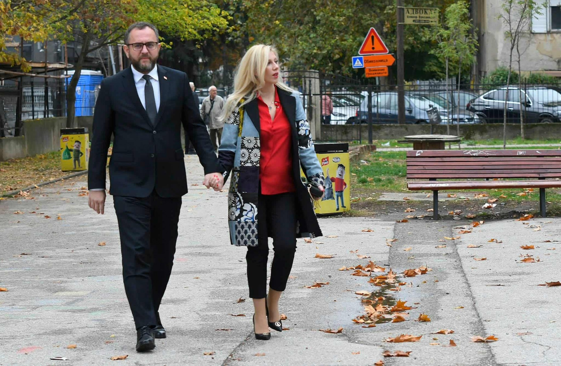Избрала впечатлив капут со модерен геометриски принт во црно-бела комбинација, над црвена кошула. Комбинацијата е елегантна, но со дозна храброст — капутот е „statement piece“ кој го носи целокупниот стајлинг. Црните панталони и класичните салонки го балансираат впечатокот и додаваат софистицираност. Црвената кошула дава живост и топлина на целината — совршен избор за есен.
