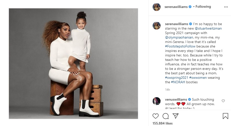Кратко видео од кампањата наречено „Стапки што треба да се следат“ Серена сподели на социјалните мрежи и ги воодушеви обожавателите. Мајката и ќерката позираа во еднакви парчиња кои се дел од новата колекција за пролет 2021 година.