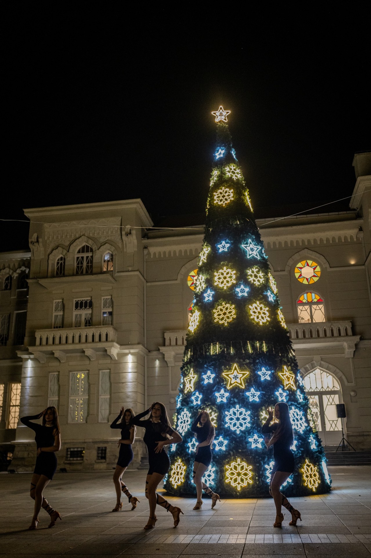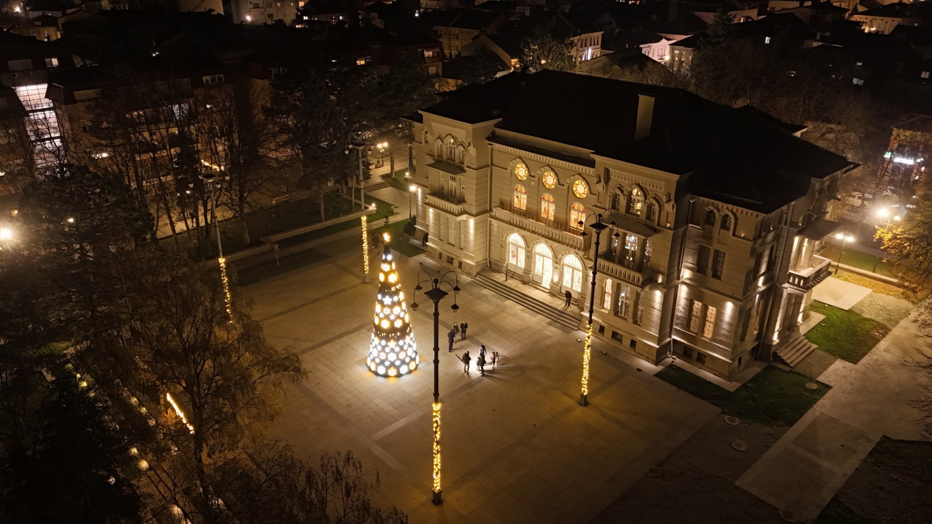 Во дворот на Офицерскиот дом доминира висока, впечатлива новогодишна елка – вистински украс на централната градска сцена, која ги собира погледите и ги повикува минувачите да застанат и да ја впијат магијата на декемвриската романтика.