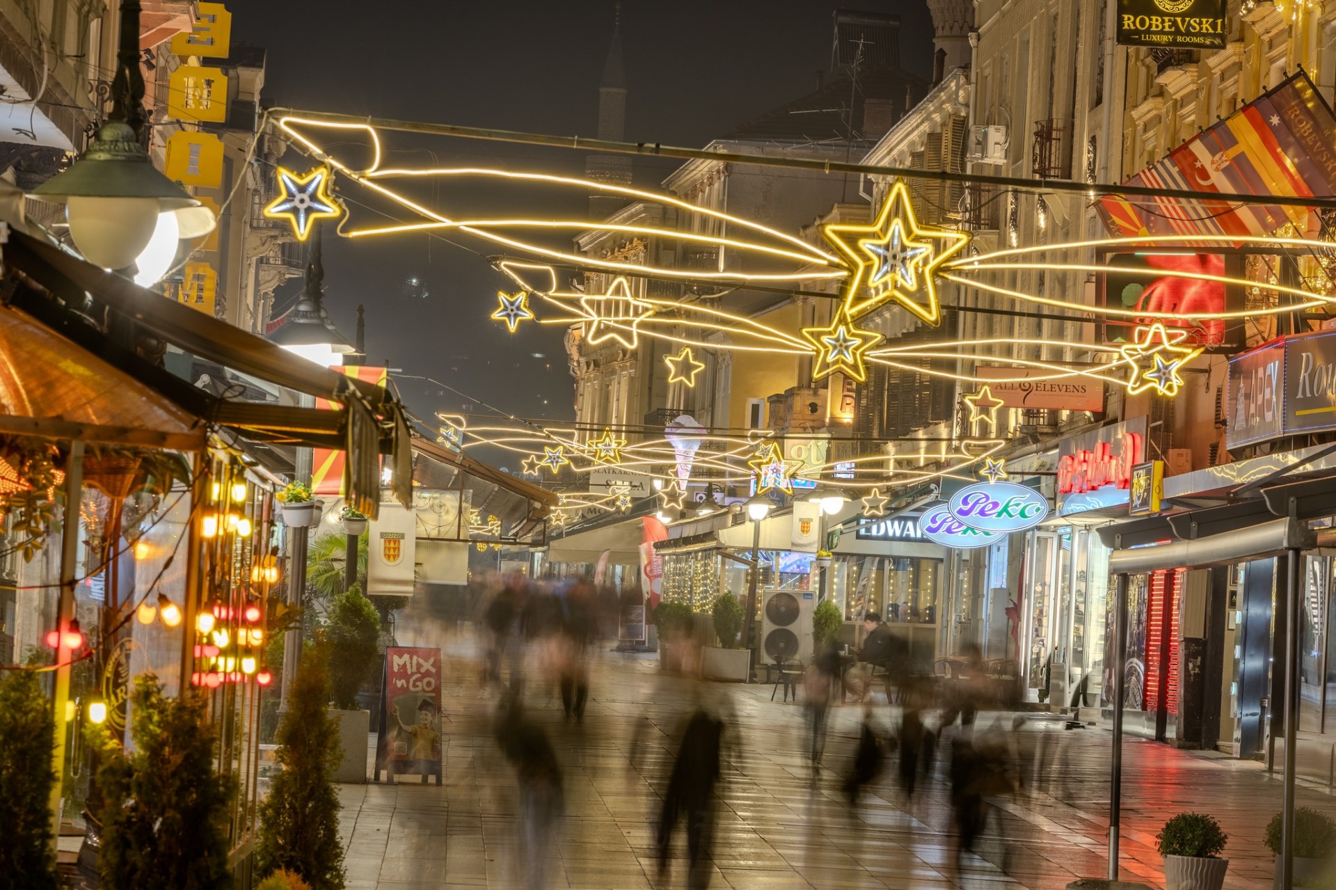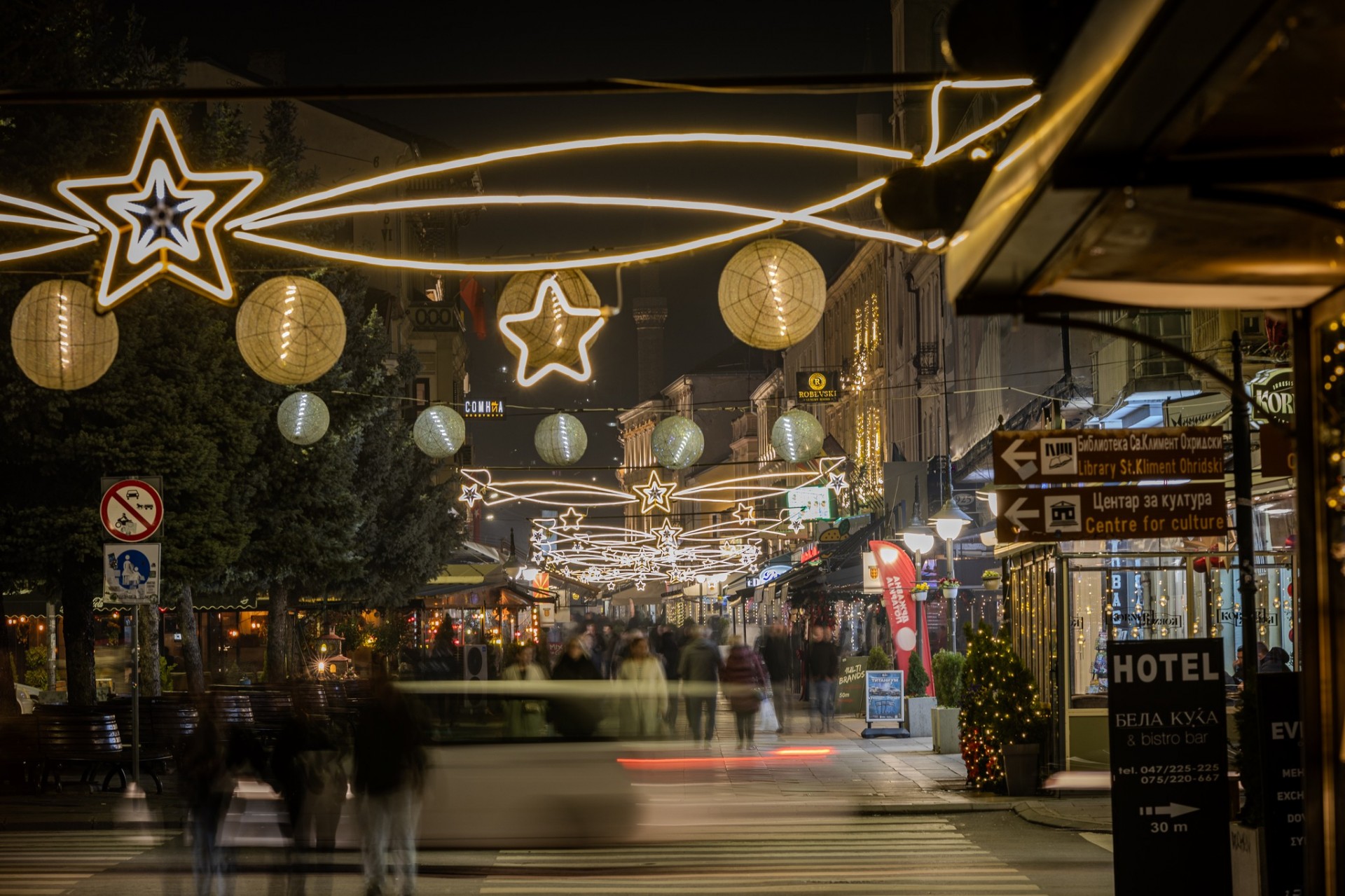 Широк Сокак, пулсот на градот, свети со илјадници светилки кои ја претвораат пешачката улица во блескав тунел од топлина и празнично расположение. Низ старите битолски сокаци во чаршијата, светлите украси ја оживуваат духот на некогашната чаршиска традиција, спојувајќи ја автентичноста со современиот празничен сјај.