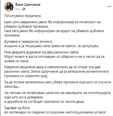 Иако од фејсбук профилот на Цветанов и Дунавка можеше да се види дека тој и неговата избраничка Трифуновска се среќно вљубени, вчера Ване објави дека сепак одлучиле да стават крај на љубовната приказна.