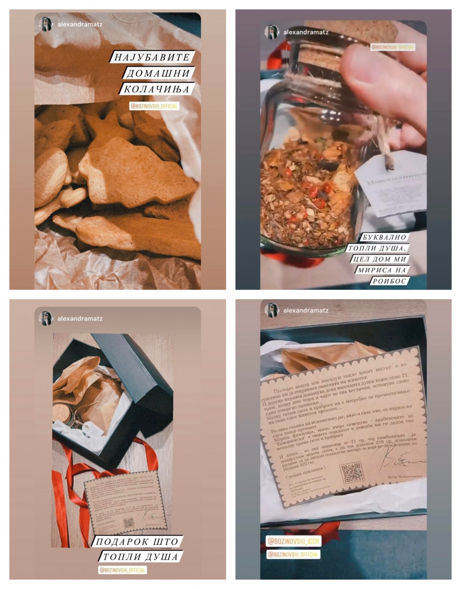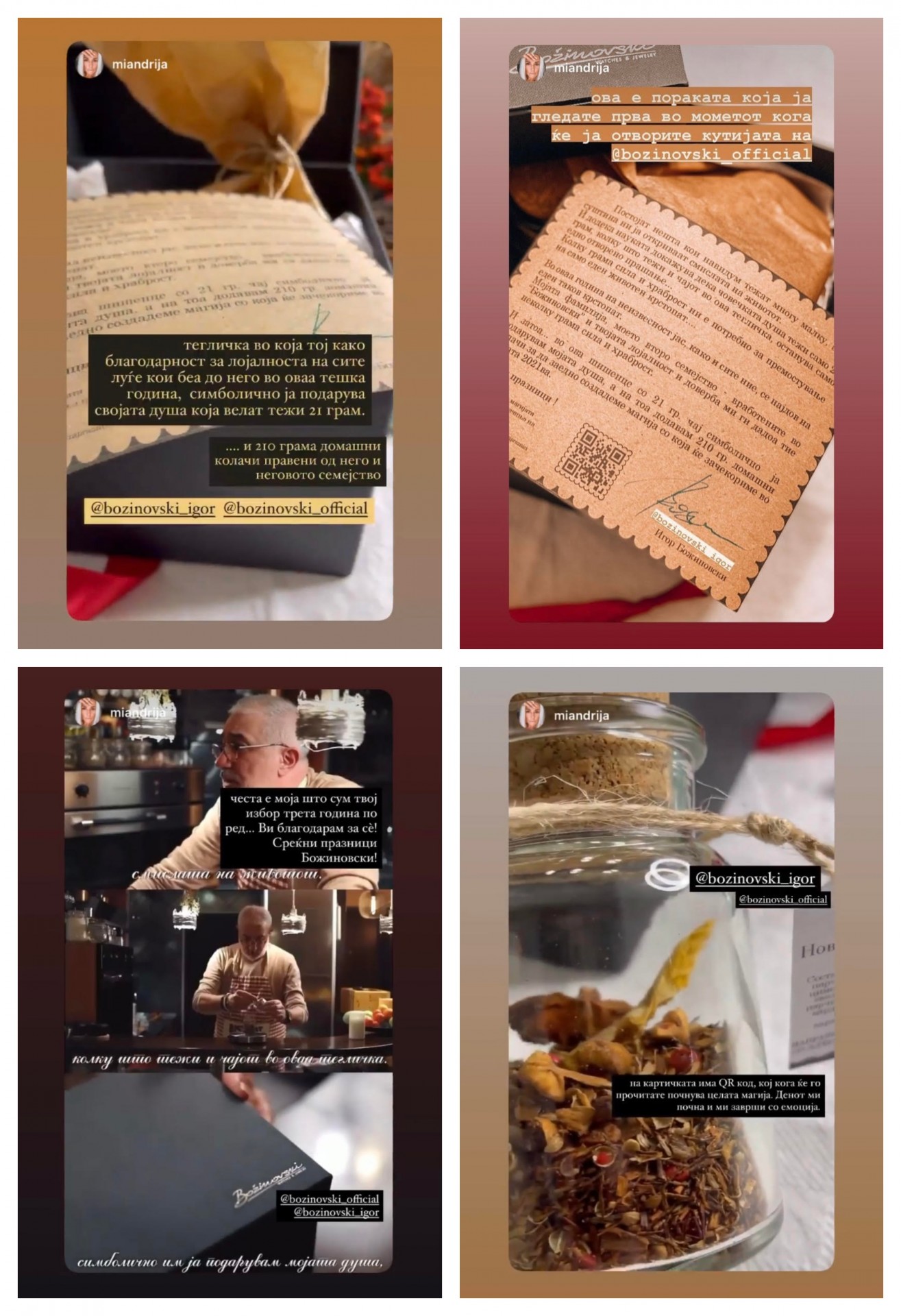 Така оваа година за своите ВИП клиенти, првиот човек на „Божиновски часовници и накит“, битолчанецот Игор Божиновски реши да направи еден гест кој е навистина за секоја пофалба и за воодушевување. Наместо стандардни подароци, тој за своите клиенти со свои раце зготви домашни колачи и специјално избра чај и истите лично им ги подари на клиентите, со искрена порака како благодарност што и во изминатата година полна со предизвици нивните клиенти останаа нивни верни поддржувачи.