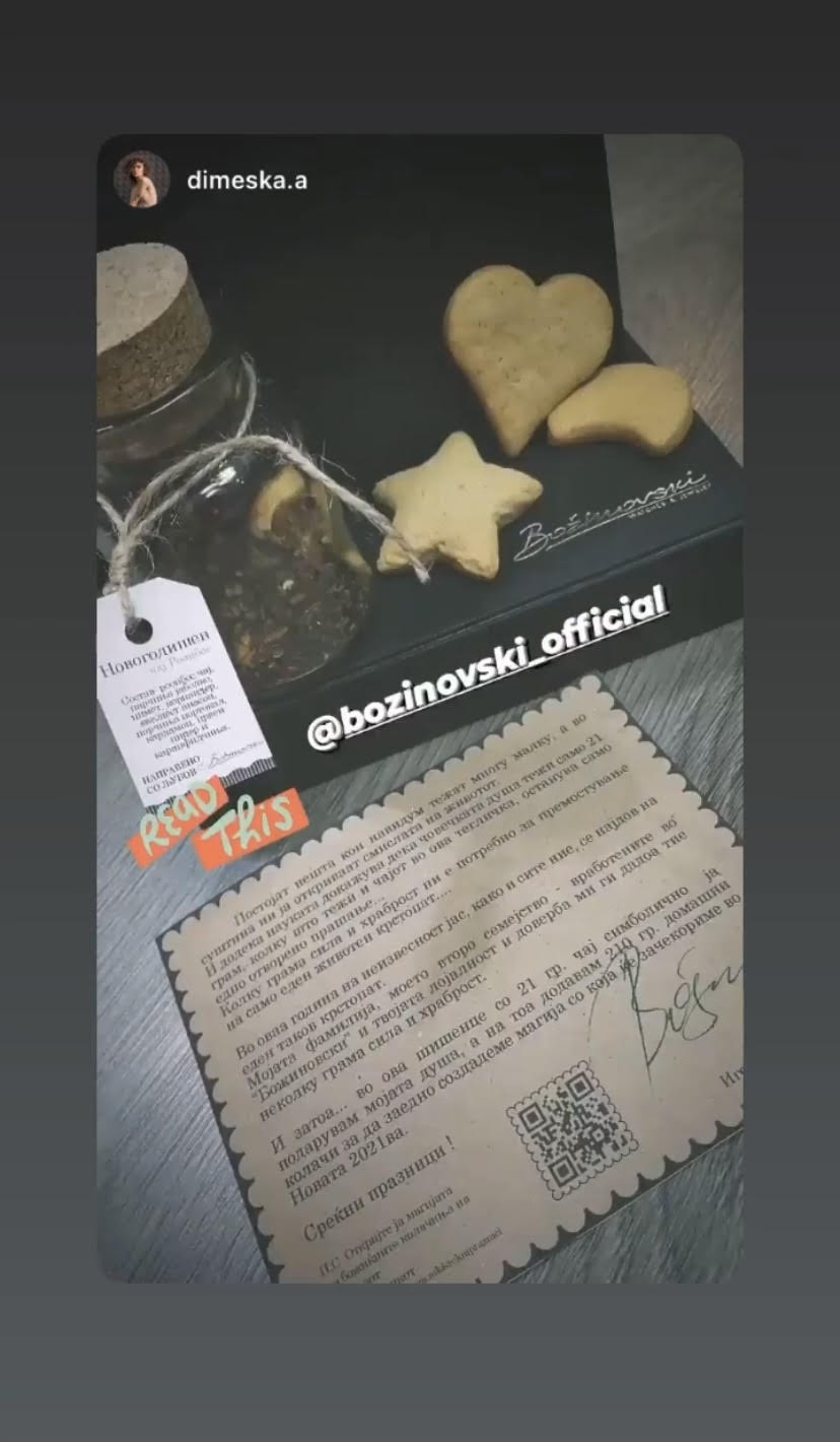 - За гестот... не знам што да кажам, до моментот на видеото бев прибрана и си реков, секоја чест за креативноста, но во моментот кога видов дека вистина колачите излегле од домот на Божиновски во Битола до секој од нас, кој имаше шанса да ја почувствува хармонијата и топлината на неговиот дом, едвај си ги држев солзите и по стоти пат си потврдив дека креативноста и сѐ можно што прави го прави поинаку од сите и на едно сосема поинакво ниво.