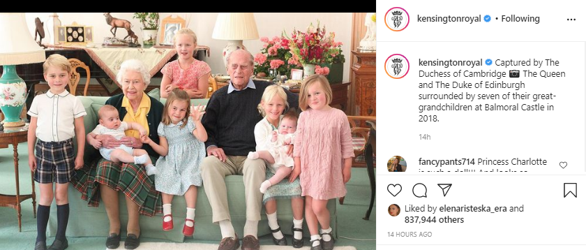 Официјалната страница на британското кралско семејство на Инстаграм објави фотографија на која војводата од Единбург и кралицата Елизабета Втора позираат со седум правнуци.