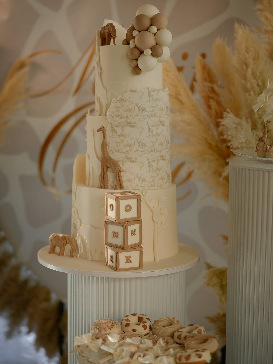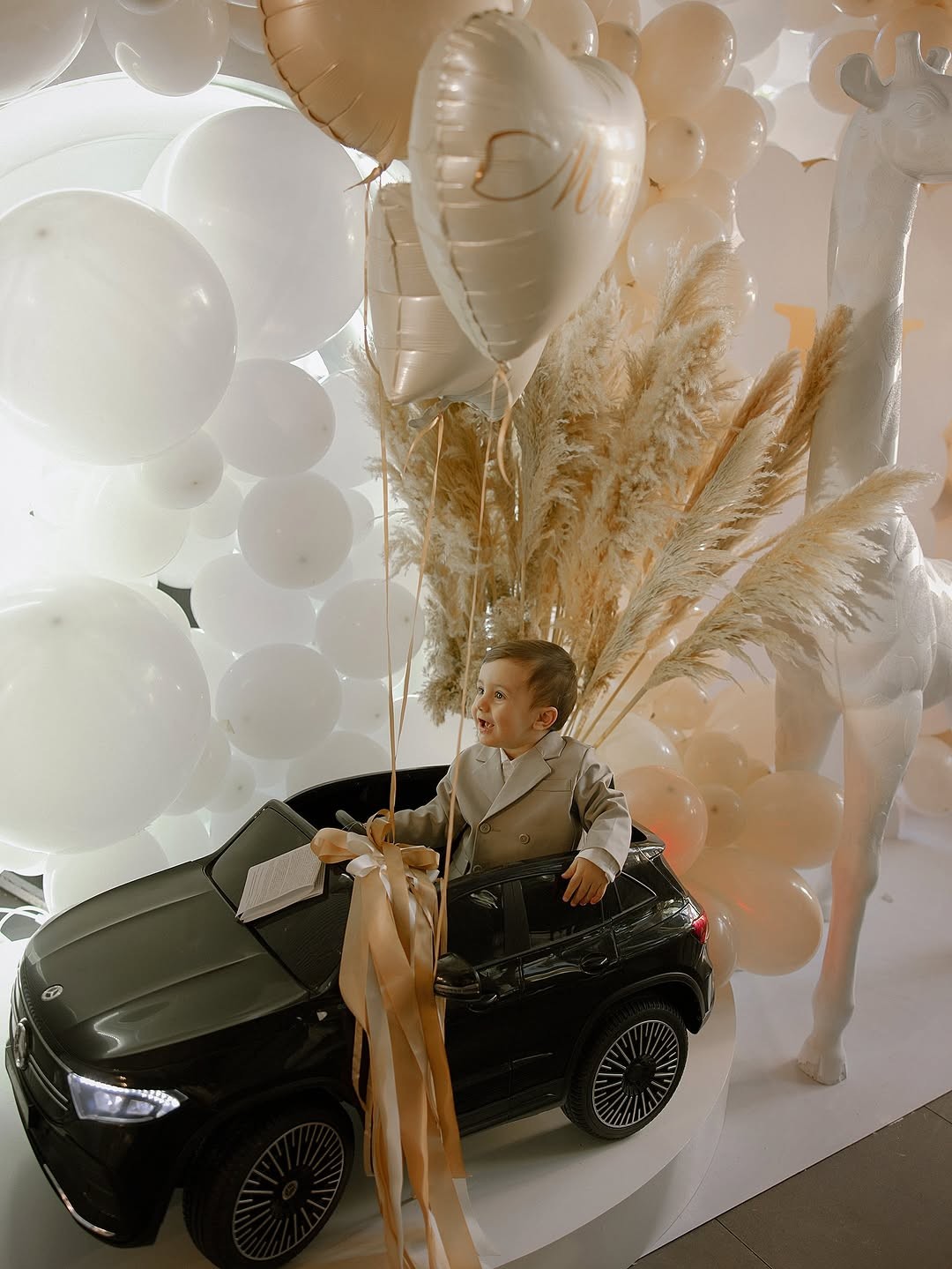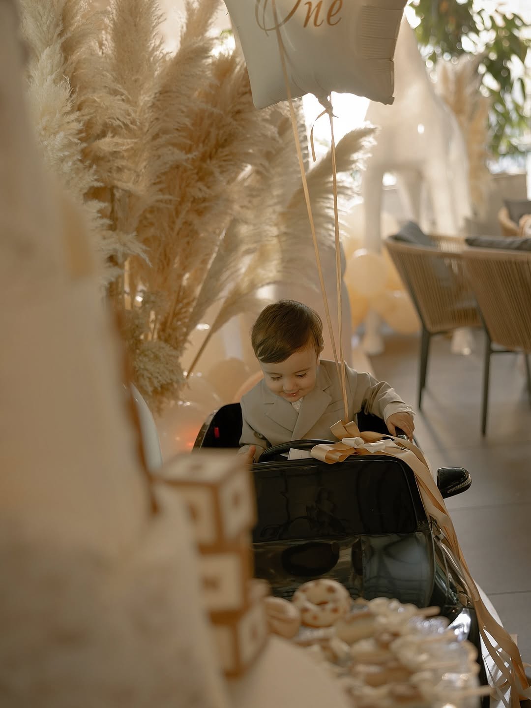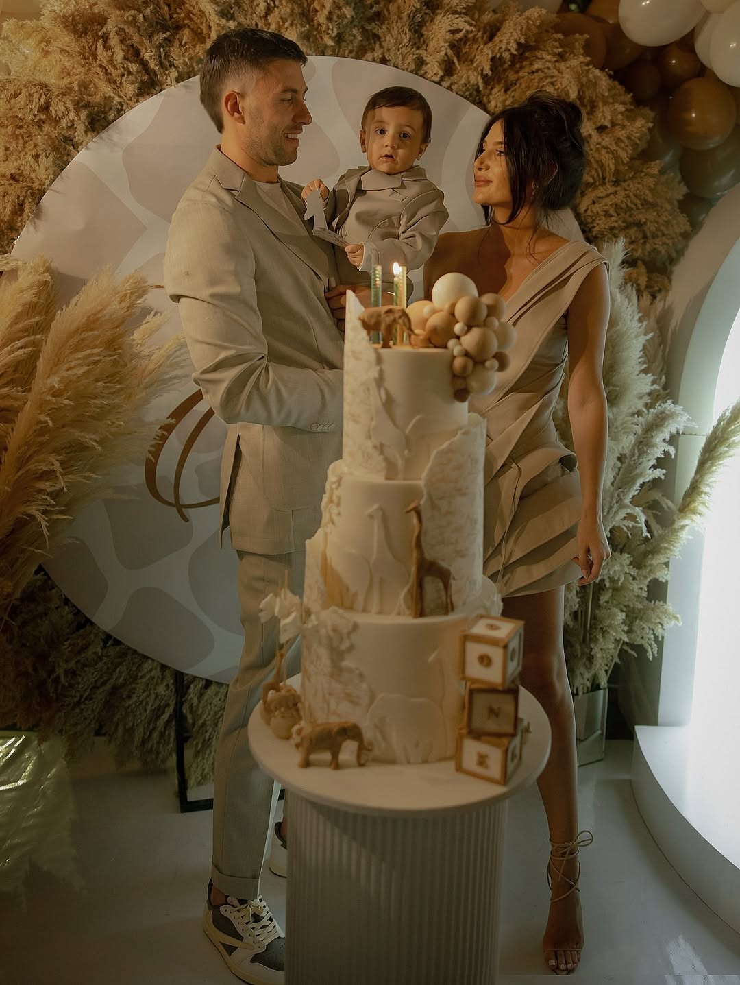 Декорацијата беше во совршена комбинација на бела, кремова и валкано бела боја, што ѝ даде на прославата елегантен и топол изглед. Главниот детал беше импресивната роденденска торта, украсена со диви животни како жирафи и слонови, и симболични коцки со буквите што го формираат зборот „ONE“. Целата поставка беше внимателно усогласена, создавајќи впечаток на природна, но модерна естетика.