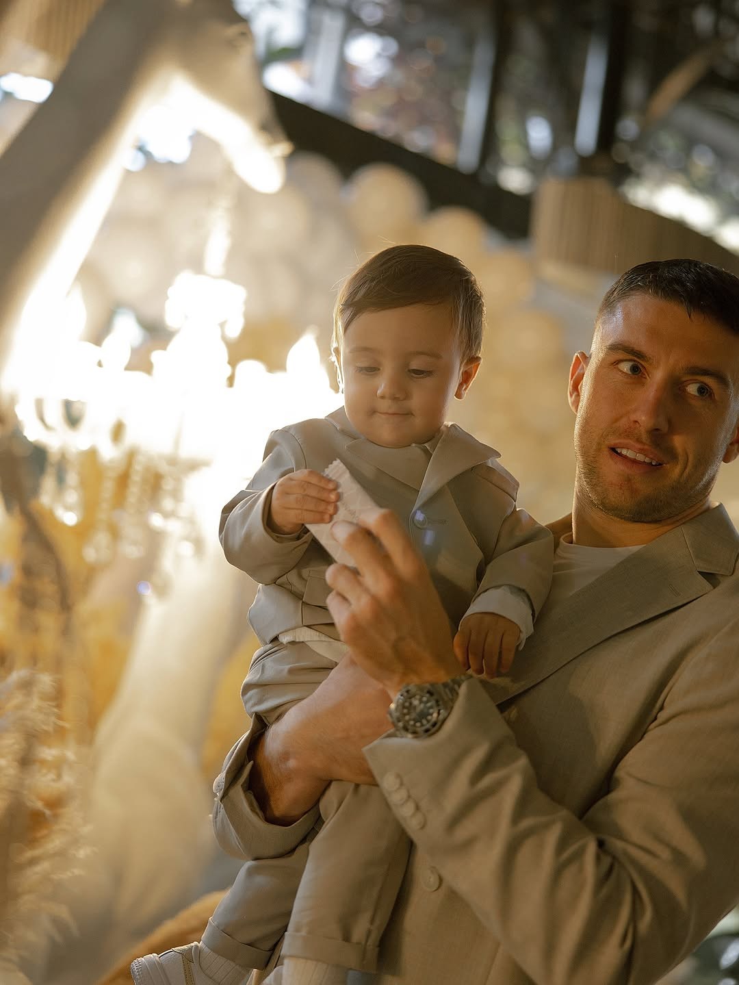 Филип, Моника и малиот Матијан беа облечени во усогласени нијанси на беж и кремова боја, што придонесе за целосната хармонија на настанот. Филип изгледаше елегантно во светол костум со спортски елементи, додека Моника блескаше во асиметрична, софистицирана тоалета што ја истакнуваше нејзината елеганција. Малечкиот Матијан, пак, беше најслаткиот дел од семејната слика, облечен во костим кој совршено се вклопуваше со изгледот на неговите родители.