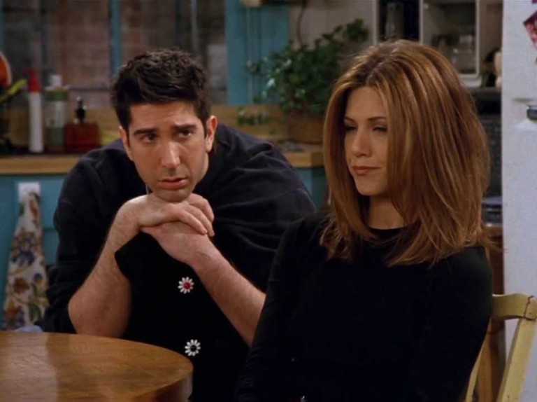 „Само се сеќавам дека еднаш му реков на Дејвид дека ќе биде глупаво ако навистина се бакнеме за прв пат пред националните телевизиски камери. И навистина, првпат се бакнавме во кафуле“, рече Анистон, осврнувајќи се на кафулето„ Централ парк“ од серијата.