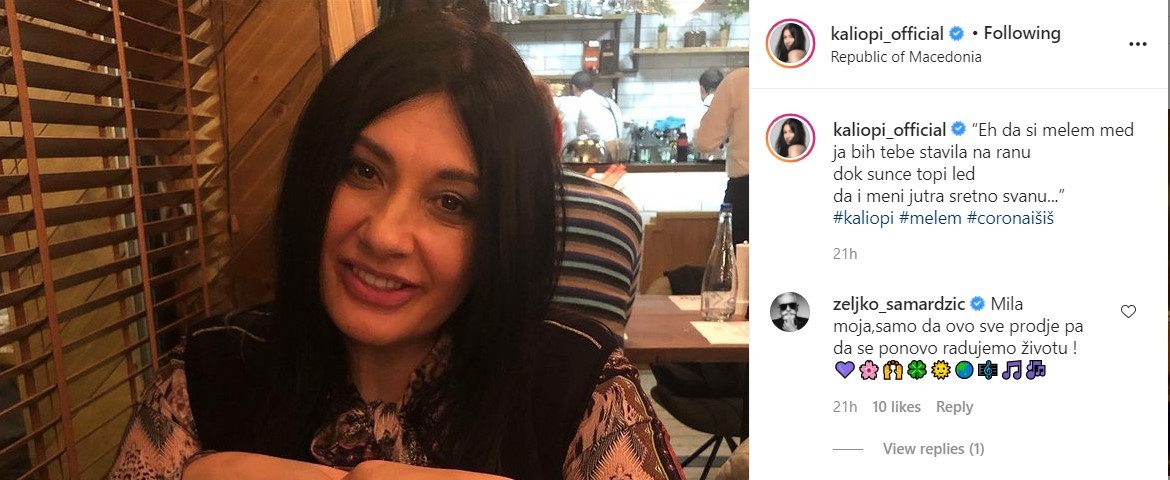 Но интересно е тоа што Жељко секогаш коментира на некоја фотографија од Калиопи кога ќе ја стави на Инстаграм. На најновата, Калиопи напиша неколку зборови од нејзина песна, а на ова се надоврза Самарџиќ со зборовите: „Мила моја, само сето ова да помине, па повторно да се радуваме на животот“