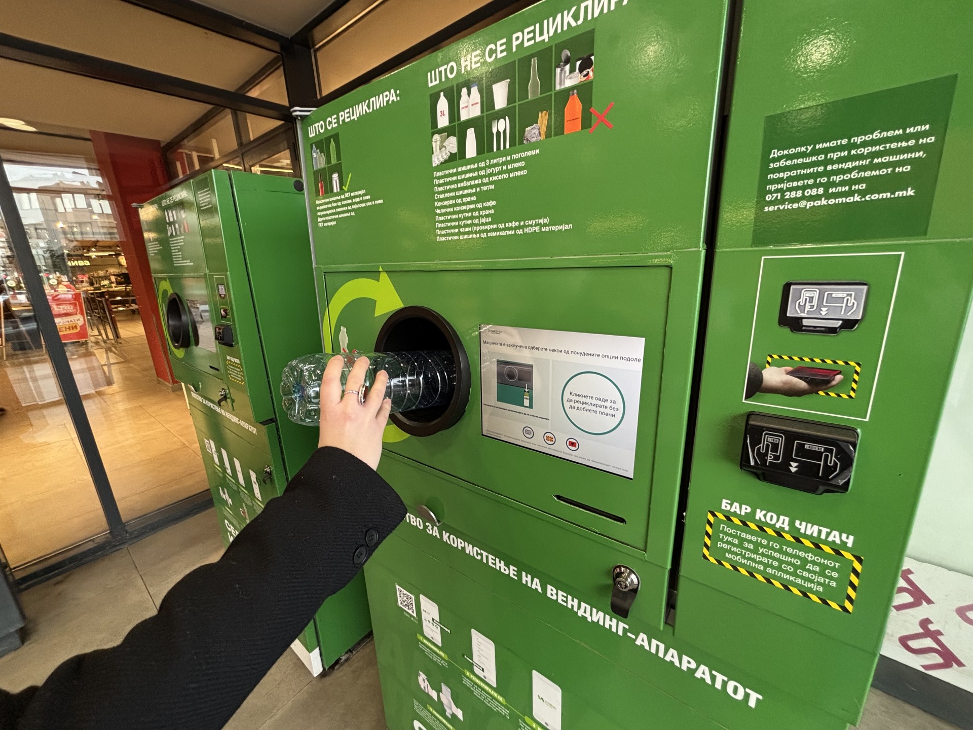 А на располагање ги имаме и Повратните вендинг машини (ПВМ) за амбалажен отпад поставени од страна на Пакомак во соработка со Швајцарската амбасада, каде може да одложуваме пластични шишиња и лименки, и за тоа да добиеме зелени вредносни поени, кои може да ги искористиме на различен начин.