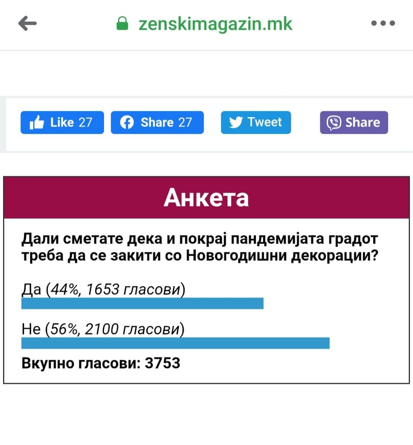 Со цел да го дознаеме јавното мислење, дали градот треба да се закити во новогодишно руво во време на пандемија и корона криза, Женски магазин спроведе онлајн анкета.