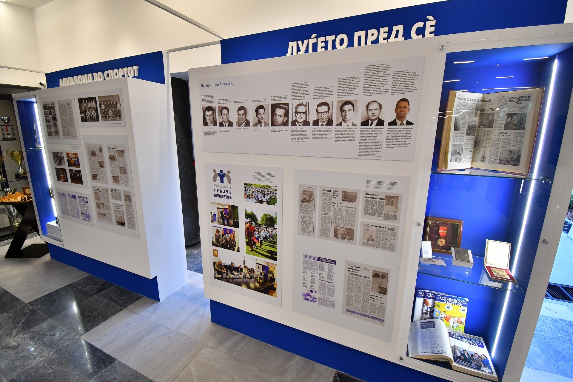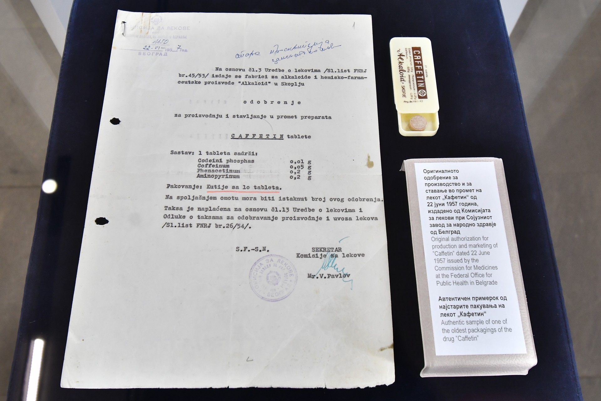 Првиот филм за „Алкалоид“ од 1950 година, најстарото кутиче и оригиналното одобрение за производство на лекот „Кафетин“; првите пакувања „Бекутан“, најстарите индустриски машини и голем број други компаниски експонати се поставени во изложбената поставка во Музејот на Град Скопје по повод 85-годишниот јубилеј на „Алкалоид“.