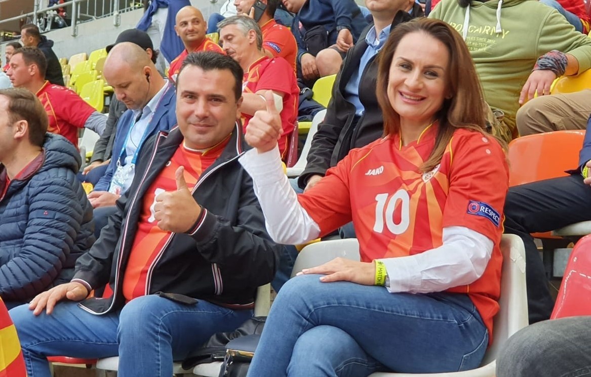Премиерот Заев со сопругата Зорица од трибините на Националната Арена во Букурешт ги бодреа нашите репрезентативци.